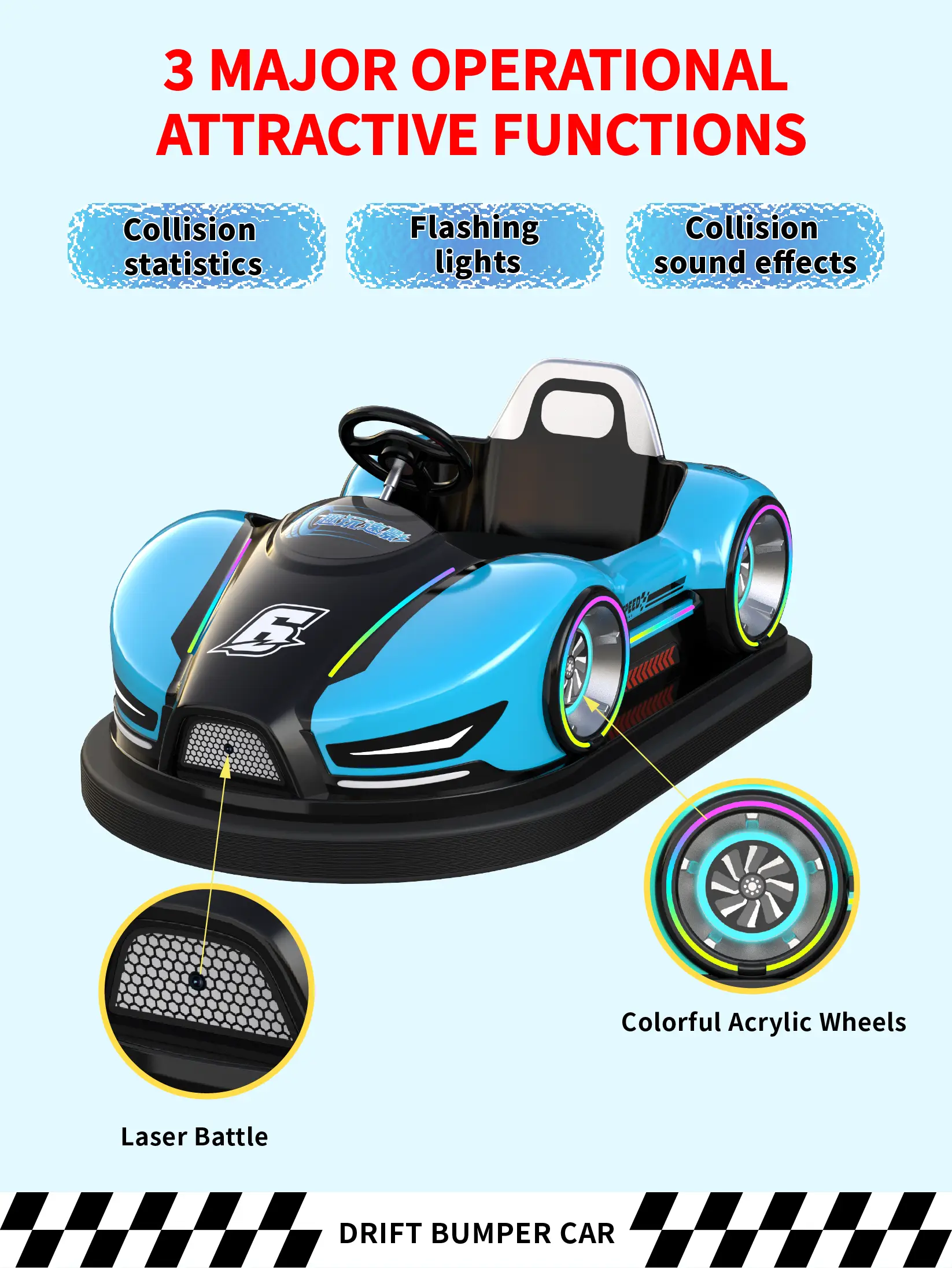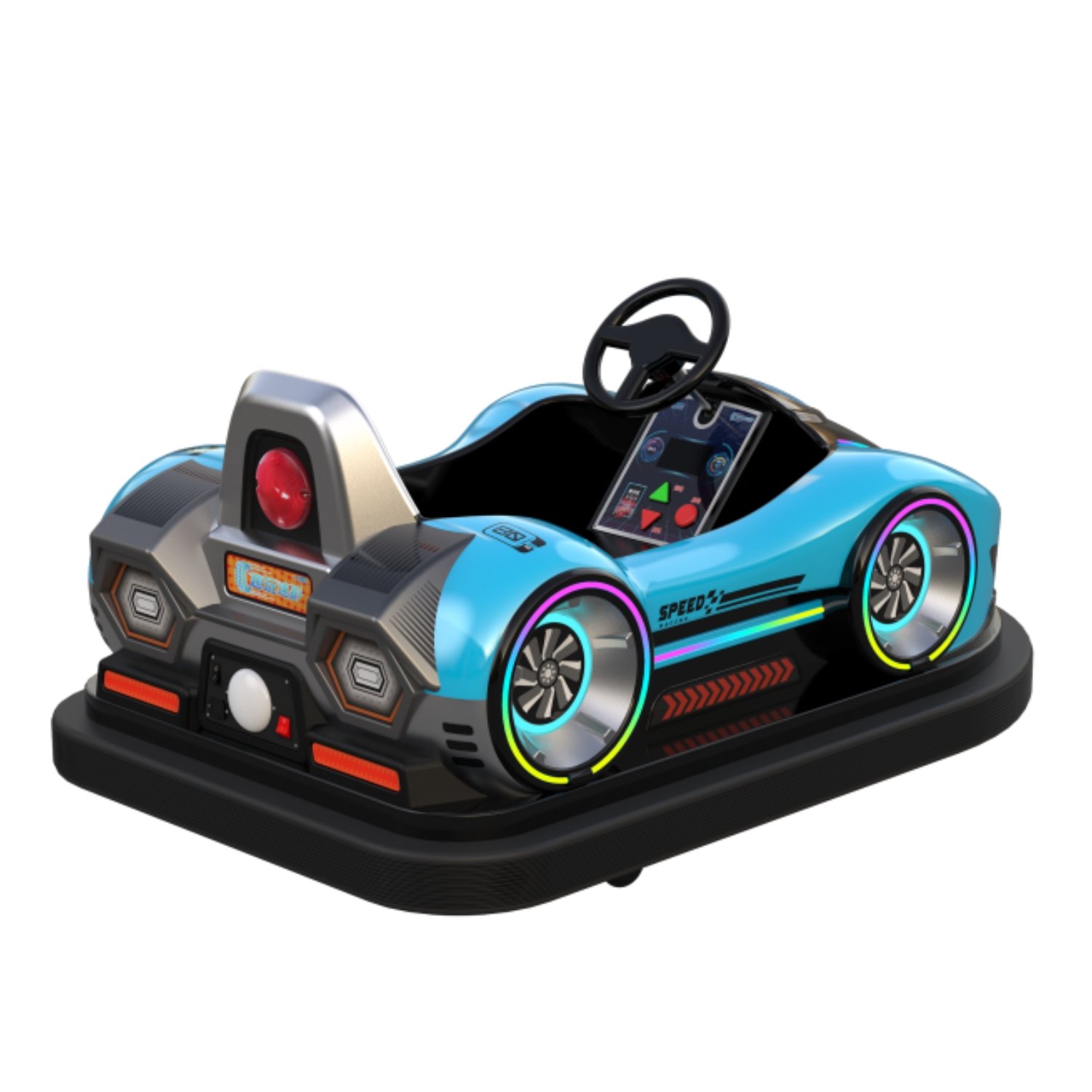 Factory-manufactured blue kiddie bumper cars with fiberglass body, interactive sensors, and advanced protection features. Durable, safe, and customizable for B2B wholesale amusement projects.