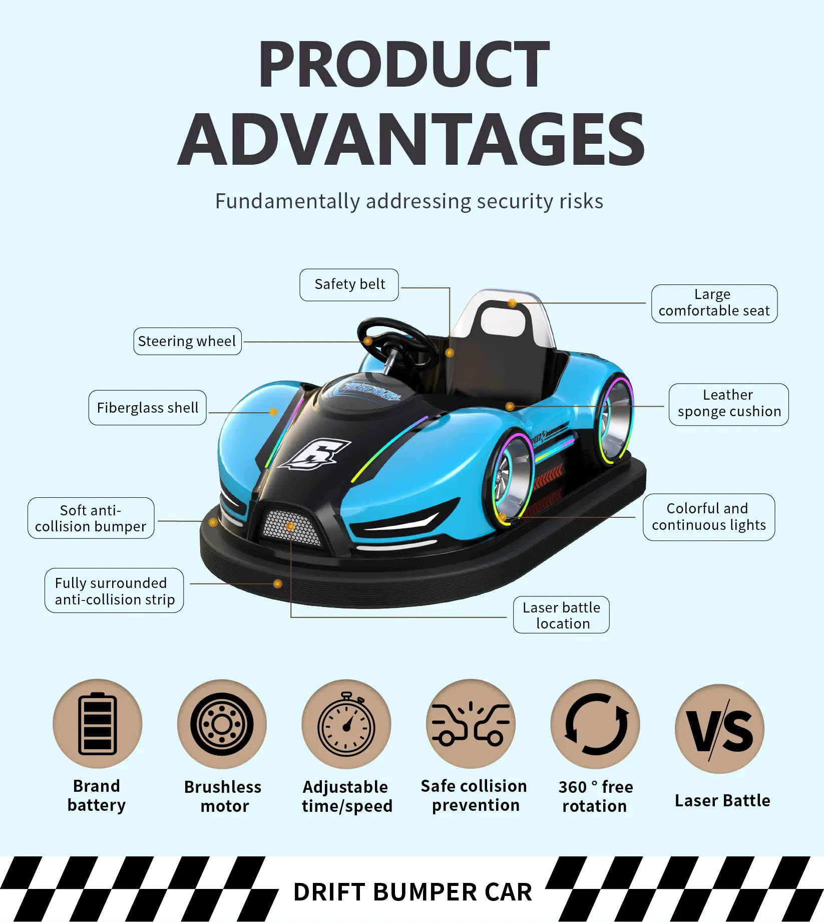 Absolutely. Our bumper cars are designed with a fiberglass structure and are UV-resistant, waterproof, anti-collision, and anti-fall, making them safe and durable for indoor amusement parks, outdoor plazas, and rental events. 🌦️