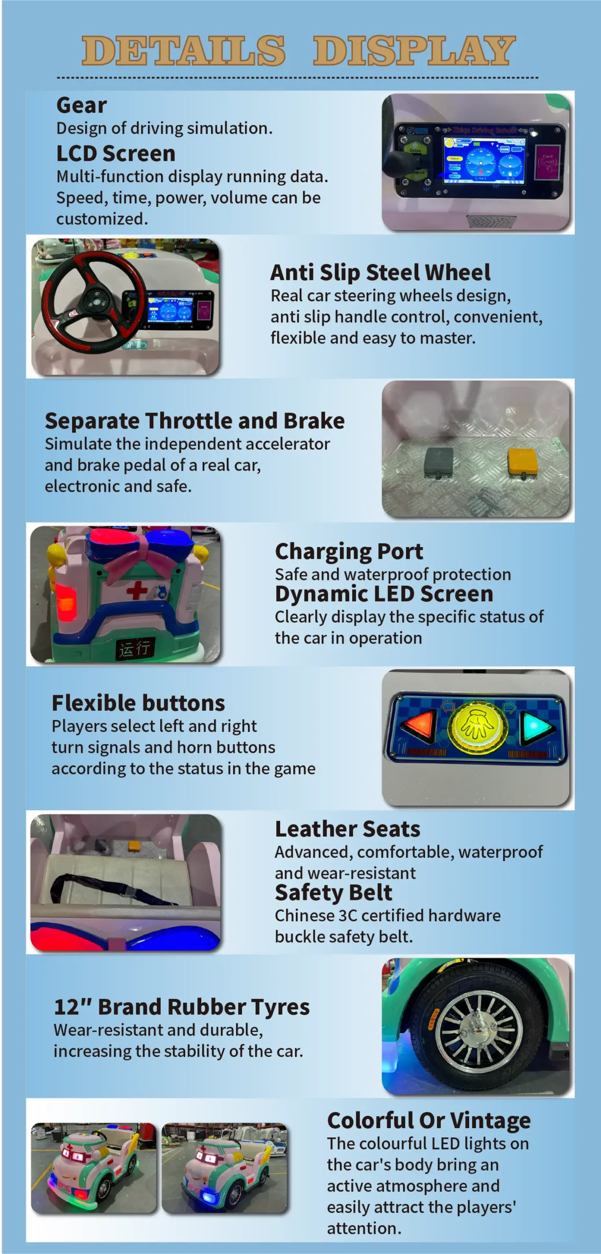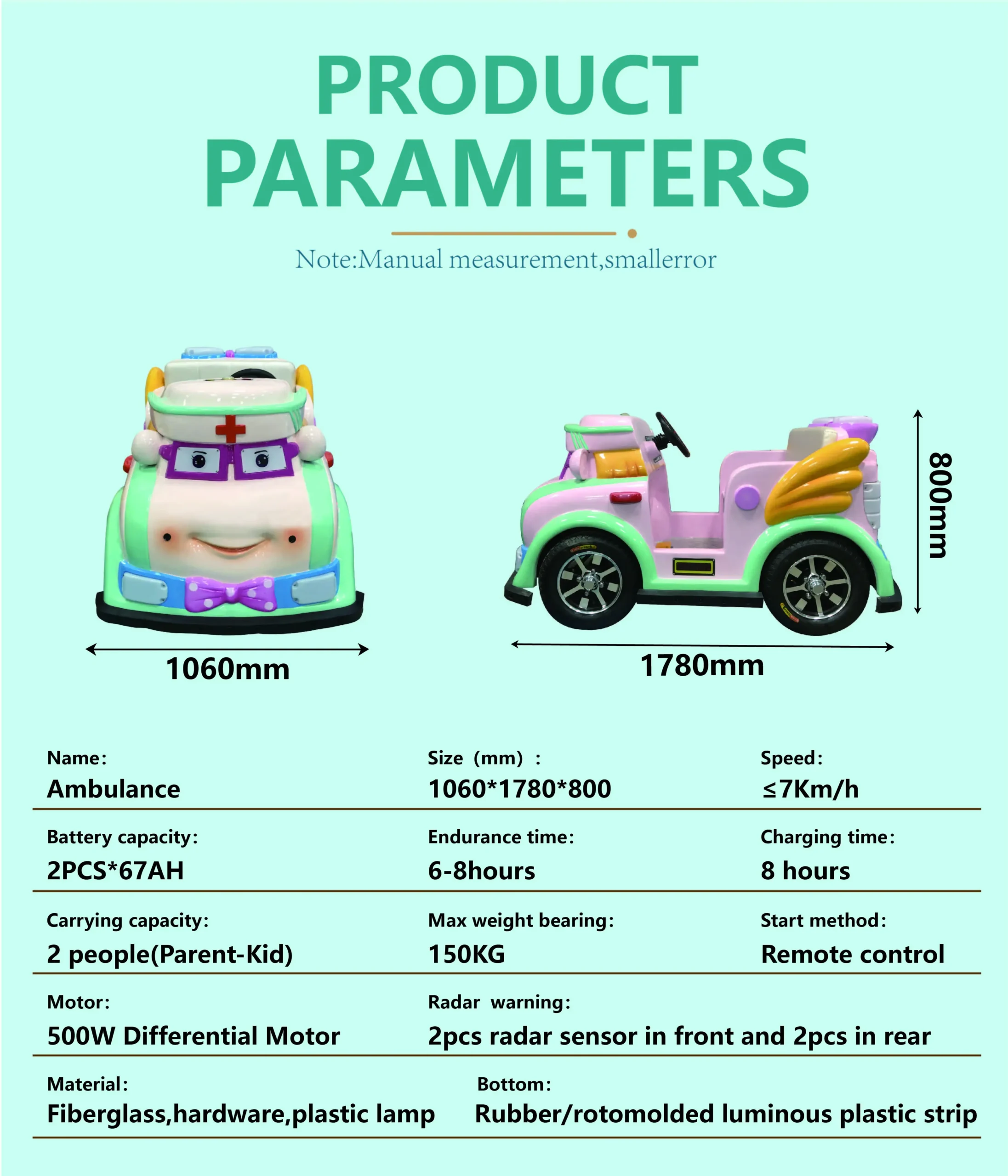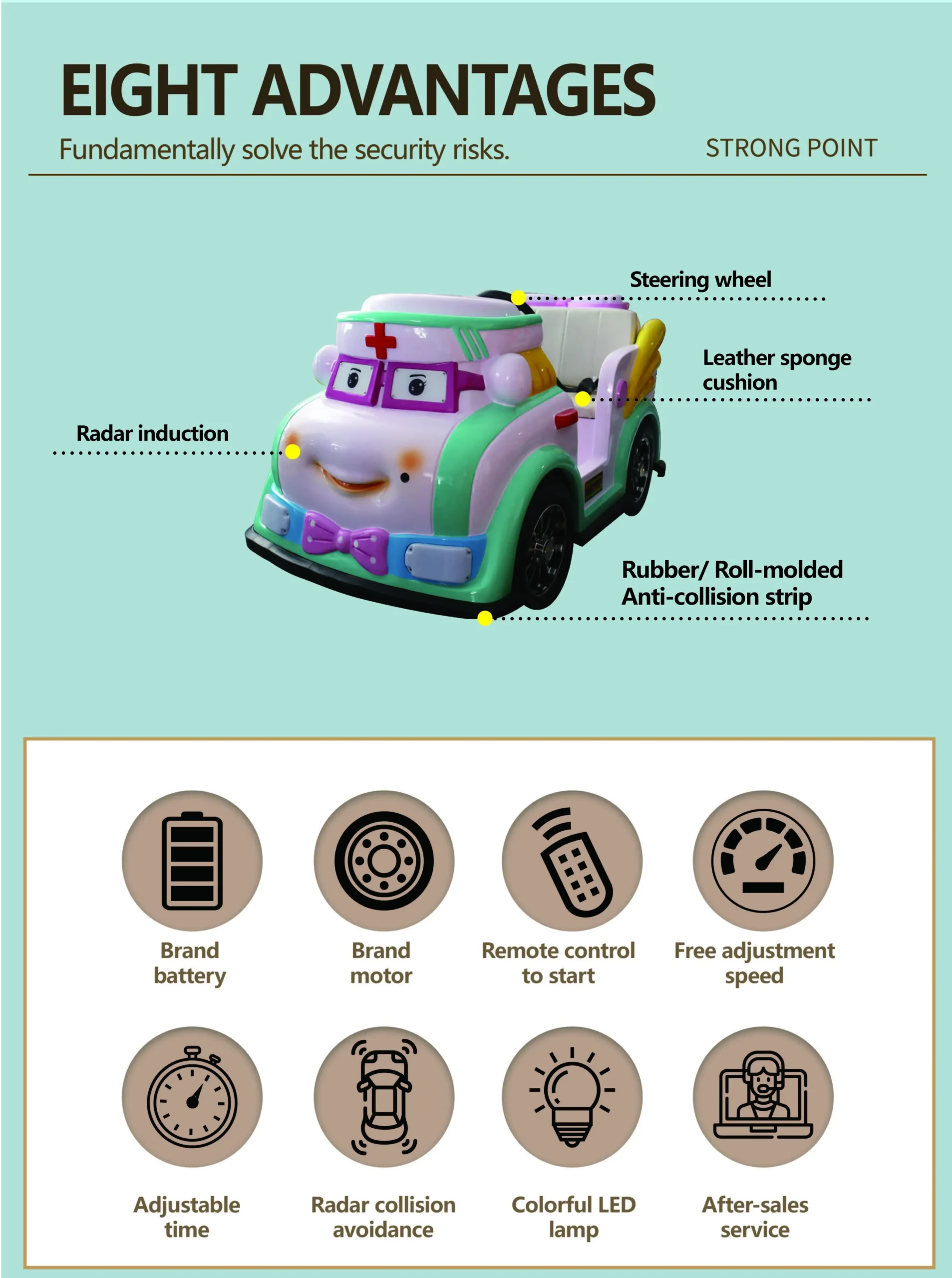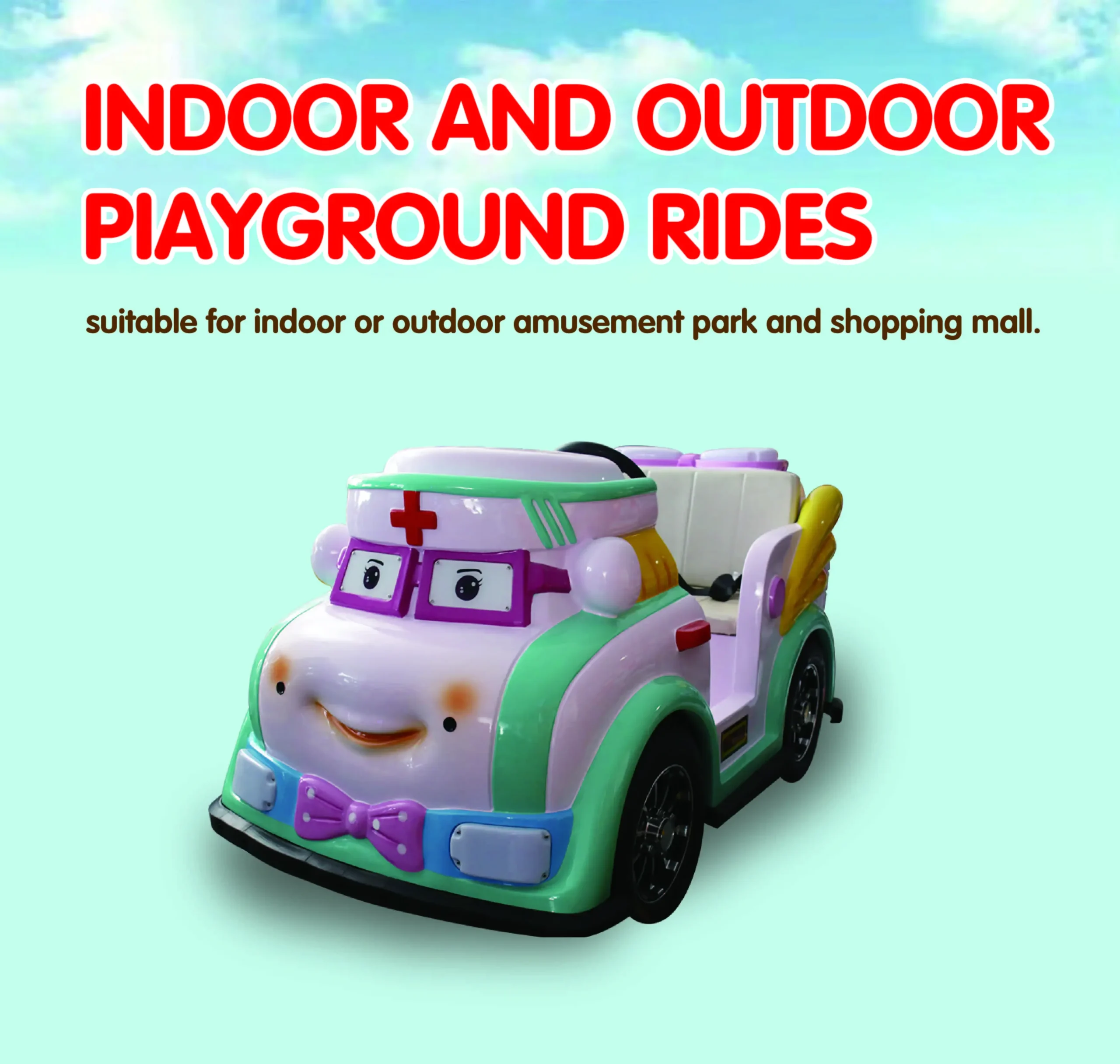 Our Cartoon Ambulance Electric Plaza Car is designed for children’s amusement in shopping malls, plazas, kindergartens, outdoor parks, playgrounds, and family entertainment centers (FECs). Built with a durable fiberglass body, the ride offers anti-collision, anti-fall, waterproof, and UV-resistant protection, ensuring long-lasting outdoor performance. With interactive sensors, LED lights, and music effects, it attracts kids instantly and provides a safe, fun driving experience. Perfect for OEM/ODM customization, this product is suitable for theme parks, rental businesses, and wholesalers worldwide.