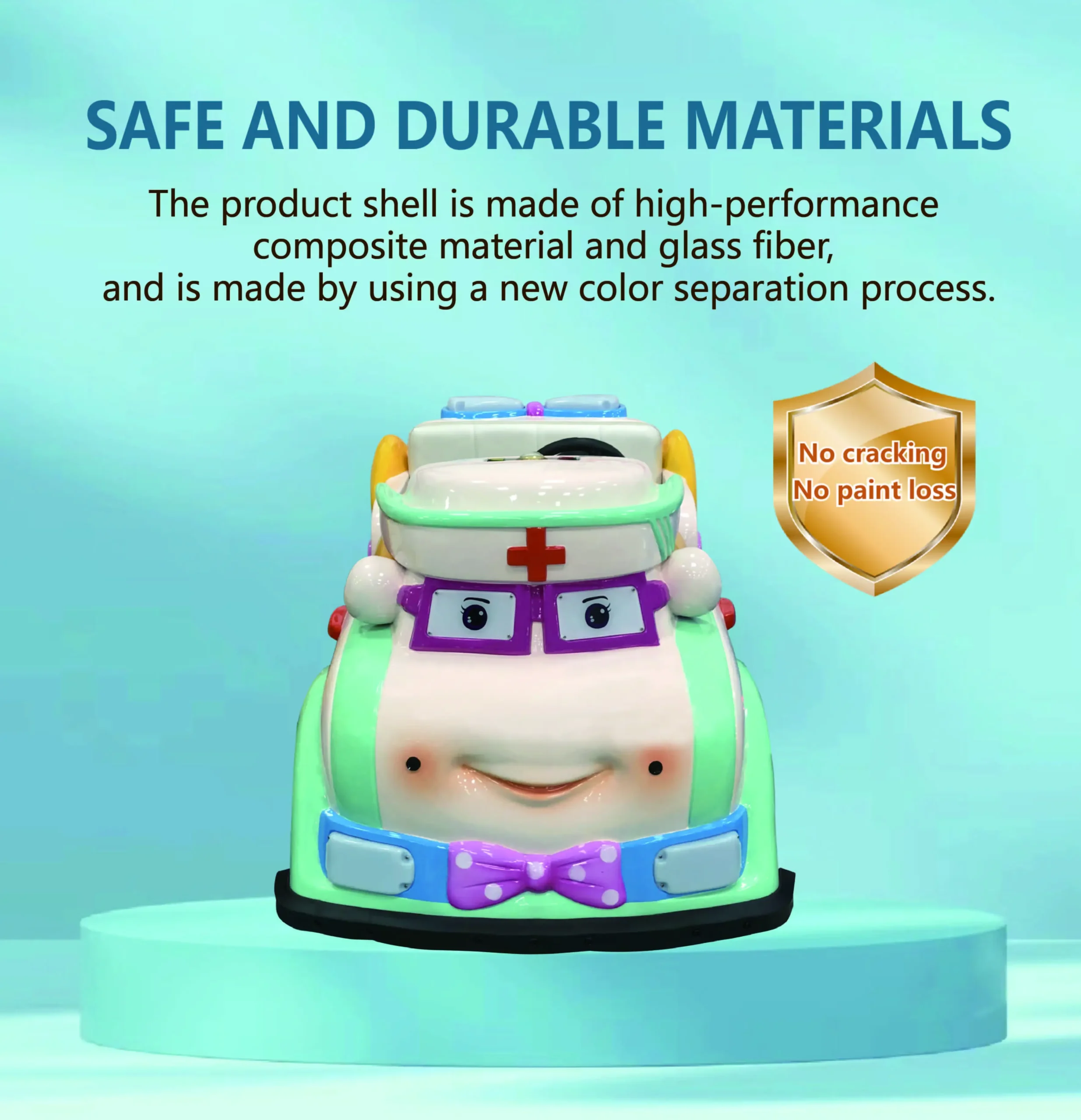 This cartoon ambulance plaza car is a durable battery-powered ride-on toy for kids. Made with fiberglass, it features LED lights, interactive sensors, high endurance, and full safety protection. OEM customization available for amusement parks, plazas, and global wholesale buyers.