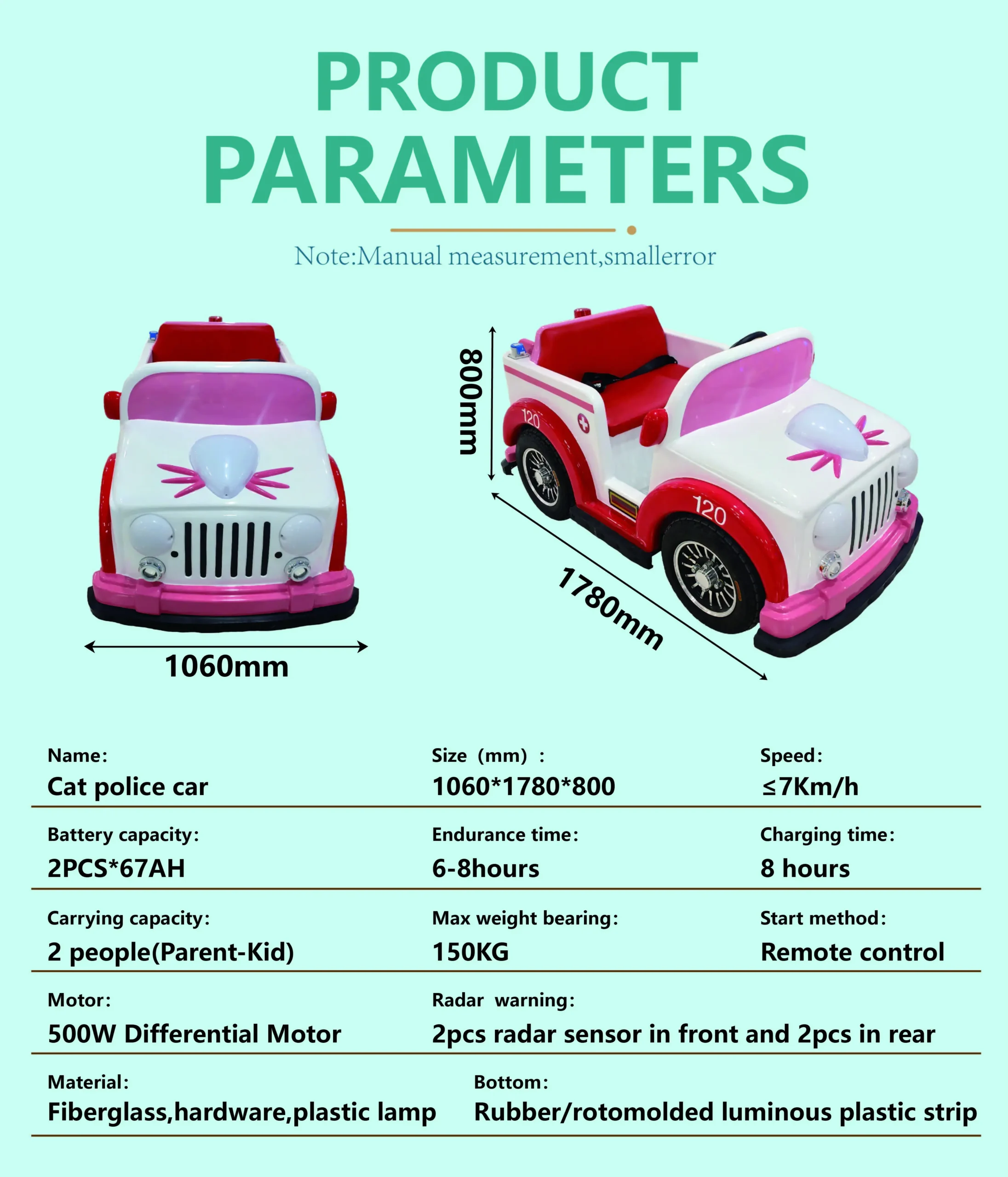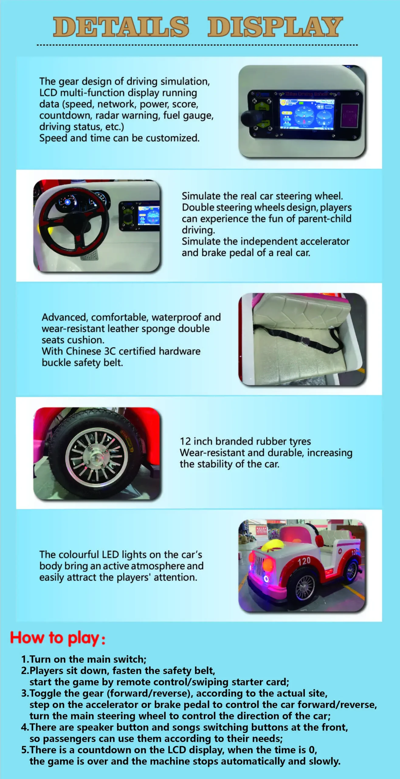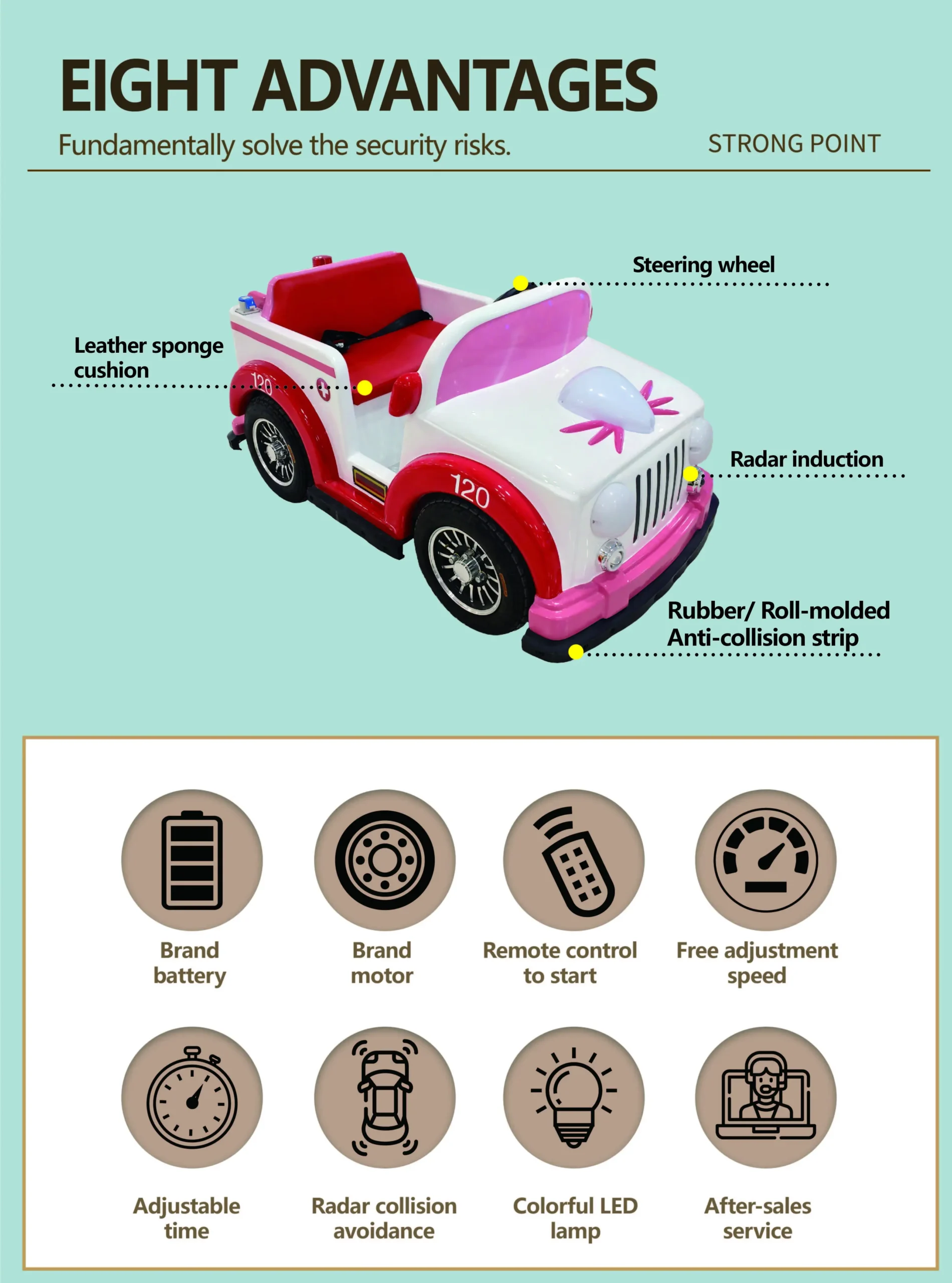 Built for outdoor plazas and commercial entertainment venues, our Cartoon Police Kiddie Ride offers unmatched durability and safety. Fiberglass construction resists impact, sun, and rain, while LED effects and interactive sensors create an engaging ride experience. With high-capacity eco-friendly batteries, this ride ensures extended play sessions. We offer OEM services, enabling buyers to customize designs, logos, and technical features for local market demands.