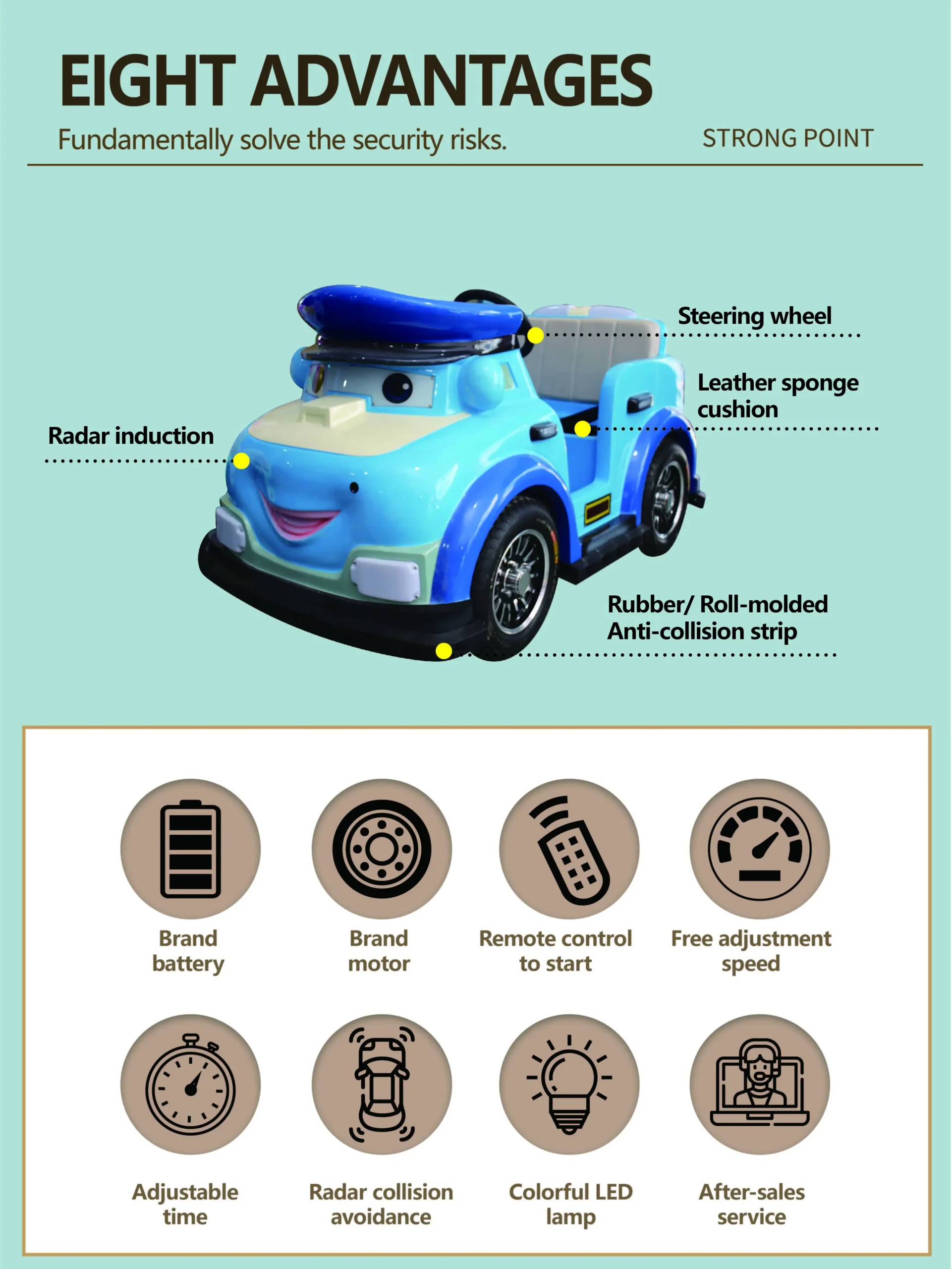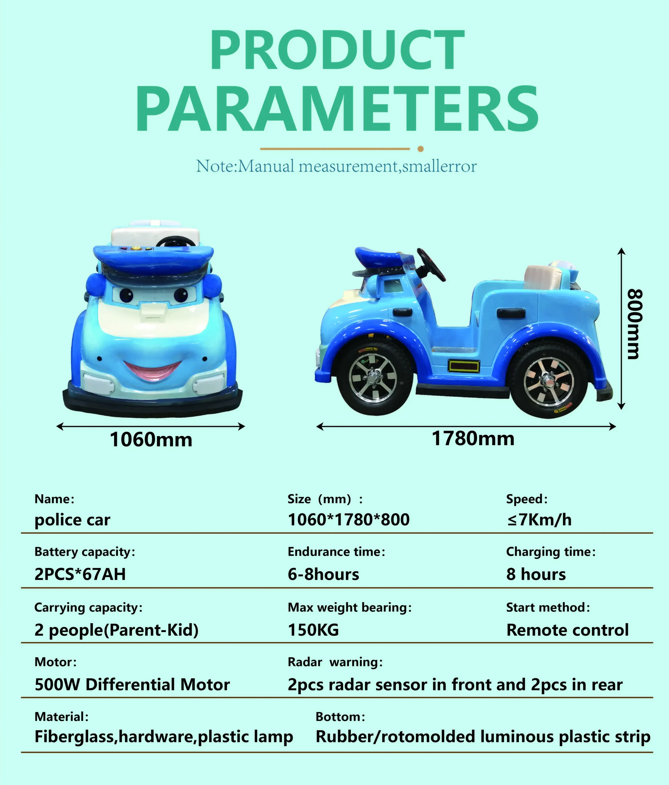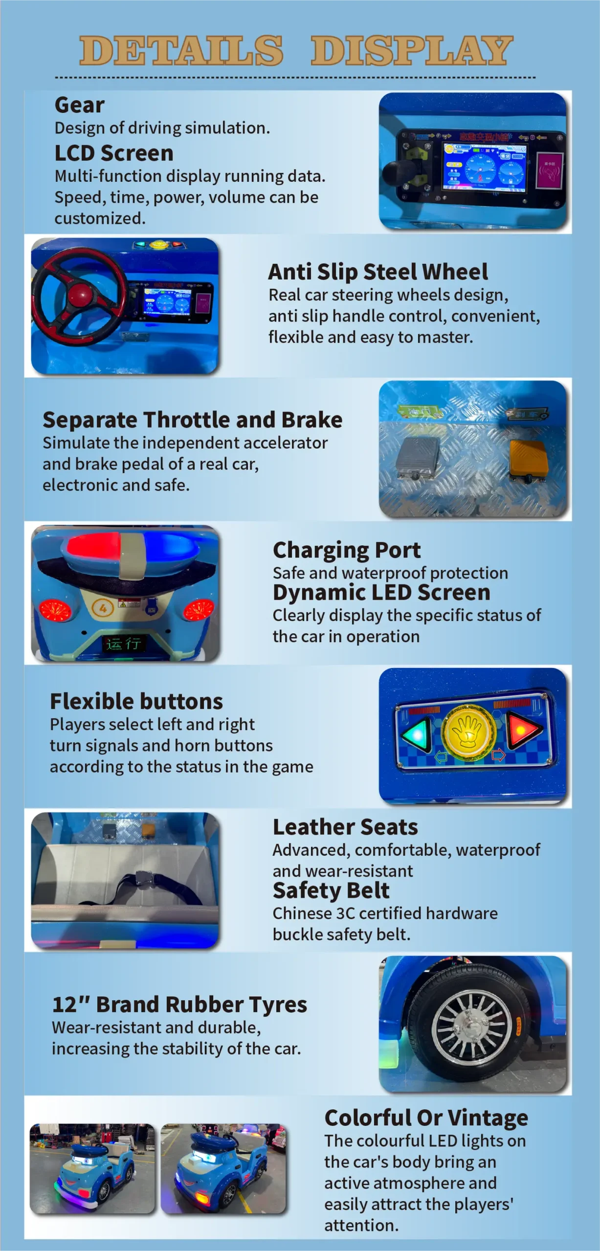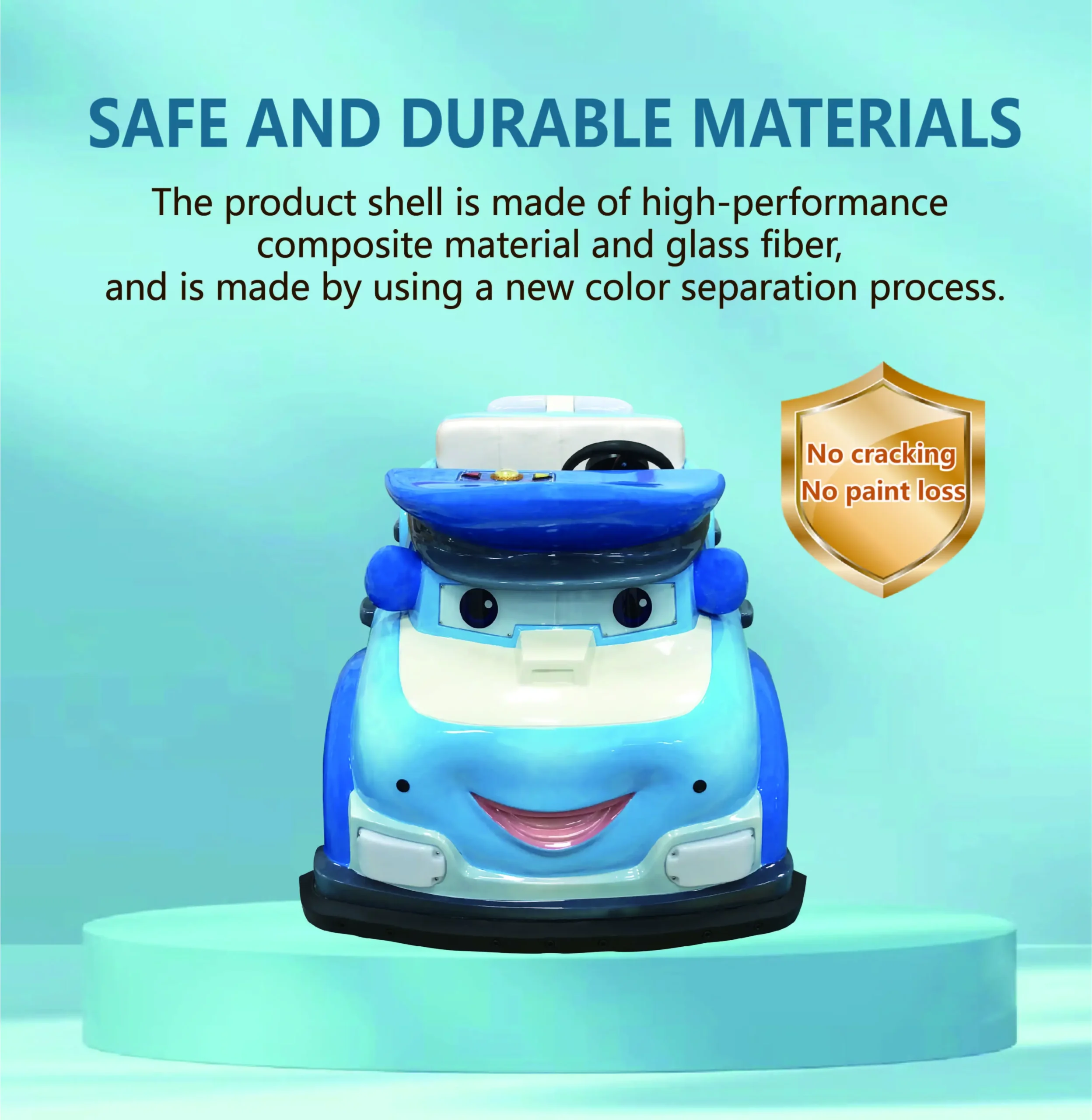 Our cartoon police ride-on car is widely used in outdoor amusement parks, plazas, shopping malls, children’s playgrounds, rental businesses, and theme parks. With fiberglass construction and interactive sensors, the vehicle provides a safe, fun, and durable experience. LED lighting enhances visual appeal, while features like anti-crash, anti-fall, waterproof, and sun-resistant design ensure long-term performance. Ideal for B2B buyers, operators, and distributors looking for customizable OEM amusement ride solutions.