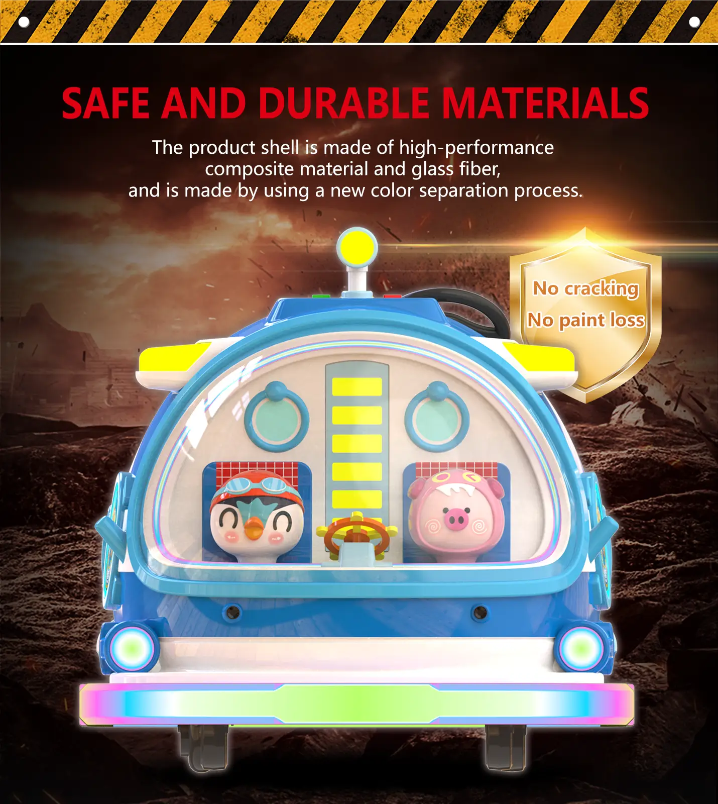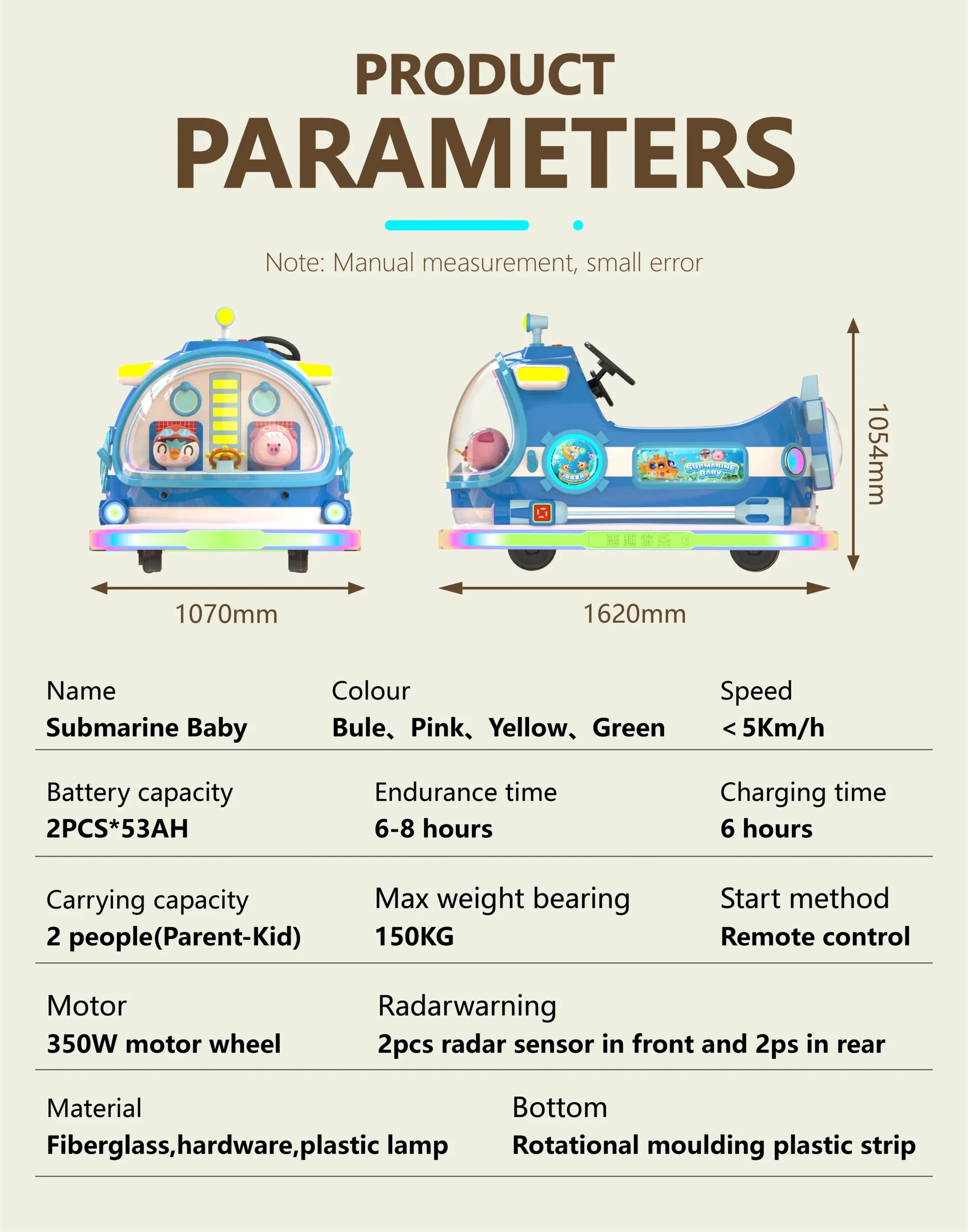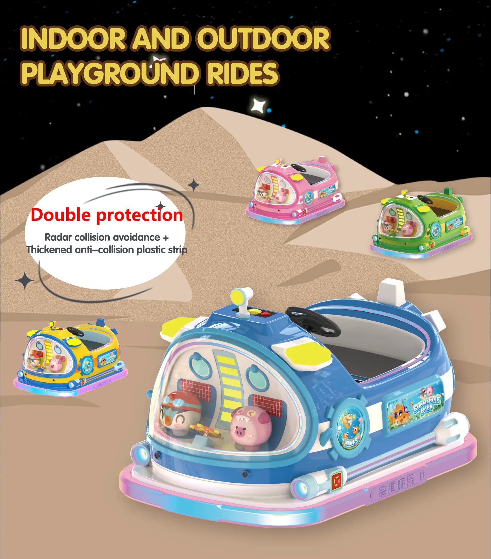 Crafted with fiberglass for maximum durability, this submarine-shaped kiddie car offers a unique and attractive design for plazas, outdoor playgrounds, and children’s parks. The integrated LED lighting and interactive sensor features create an engaging experience. Anti-collision, anti-scratch, waterproof, and UV-resistant features ensure long-lasting safety outdoors. Perfect for OEM/ODM projects, it supports wholesale customization for global amusement ride suppliers.