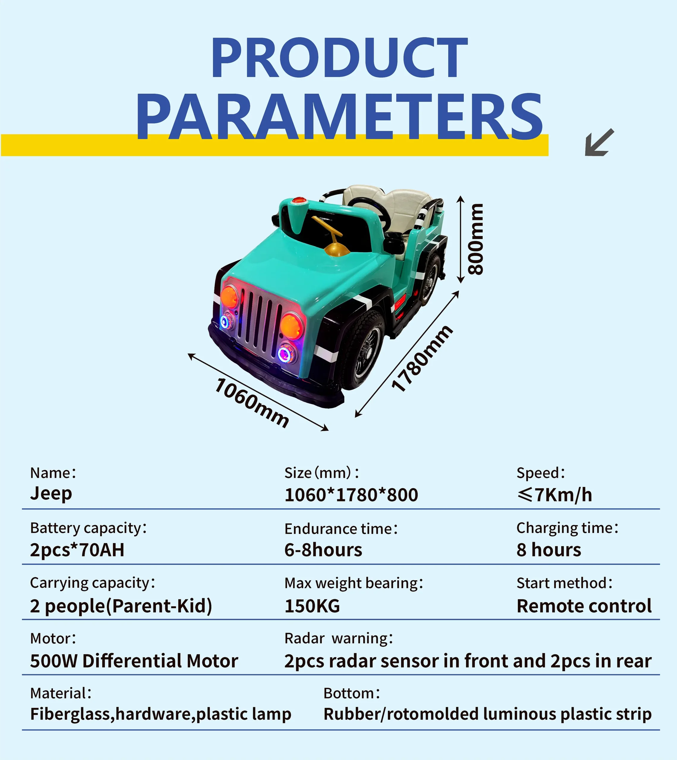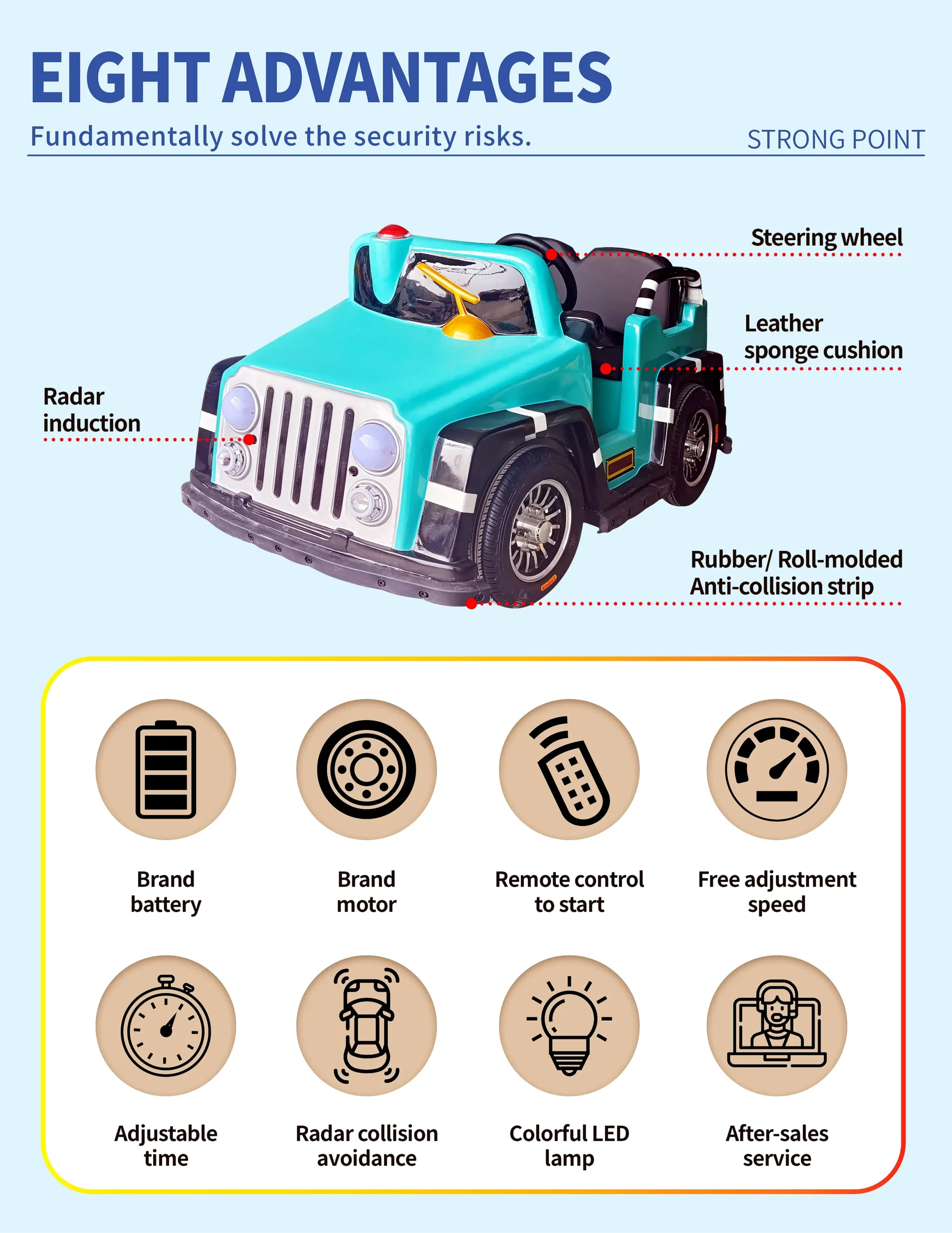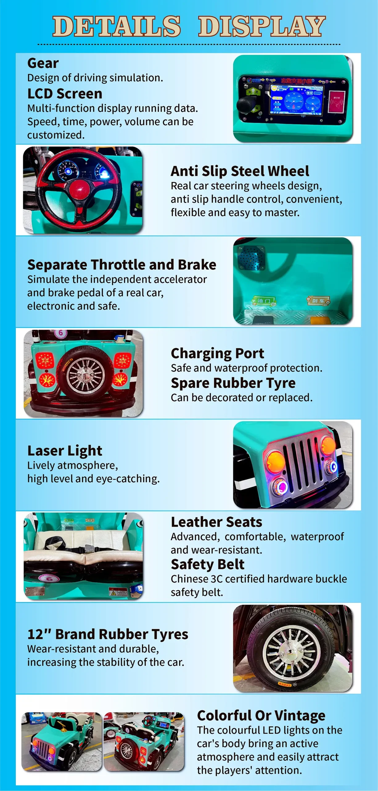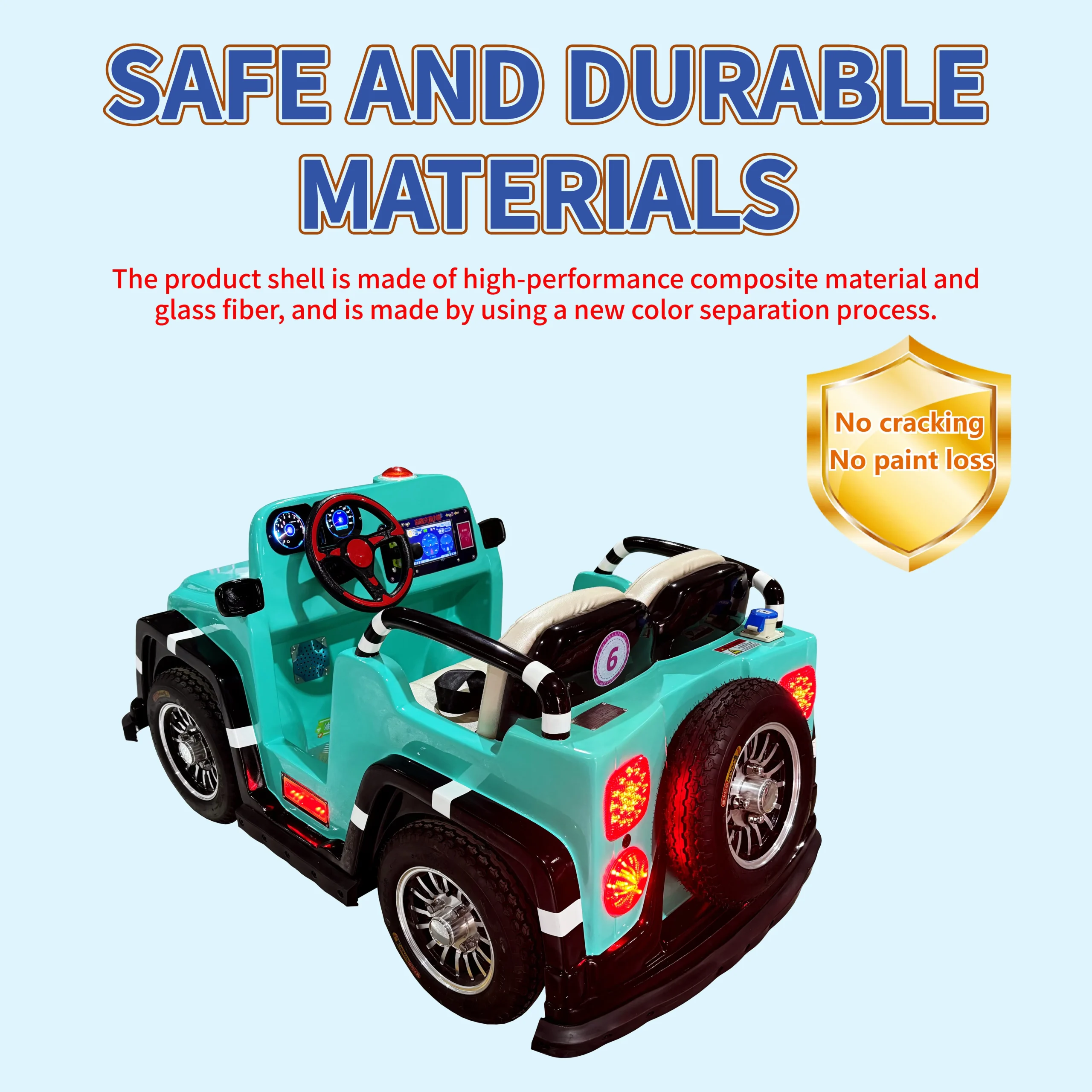 Our jeep-style kiddie plaza cars combine safety and fun with fiberglass materials, interactive sensing devices, and LED lighting. Ideal for outdoor plazas, malls, amusement parks, and kindergartens, these cars are waterproof, anti-collision, and sun-resistant. With long battery life and eco-friendly construction, they are built for durability and customer satisfaction. OEM clients can request customization in design, branding, and features, making them the perfect investment for B2B amusement ride businesses.