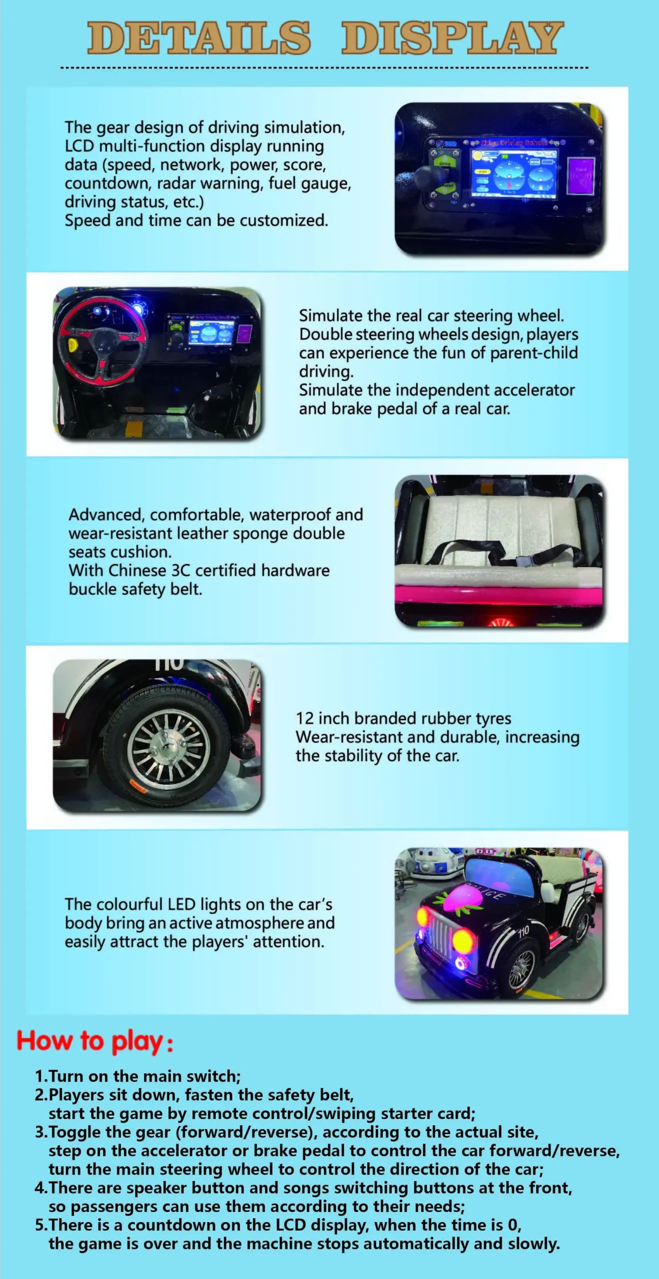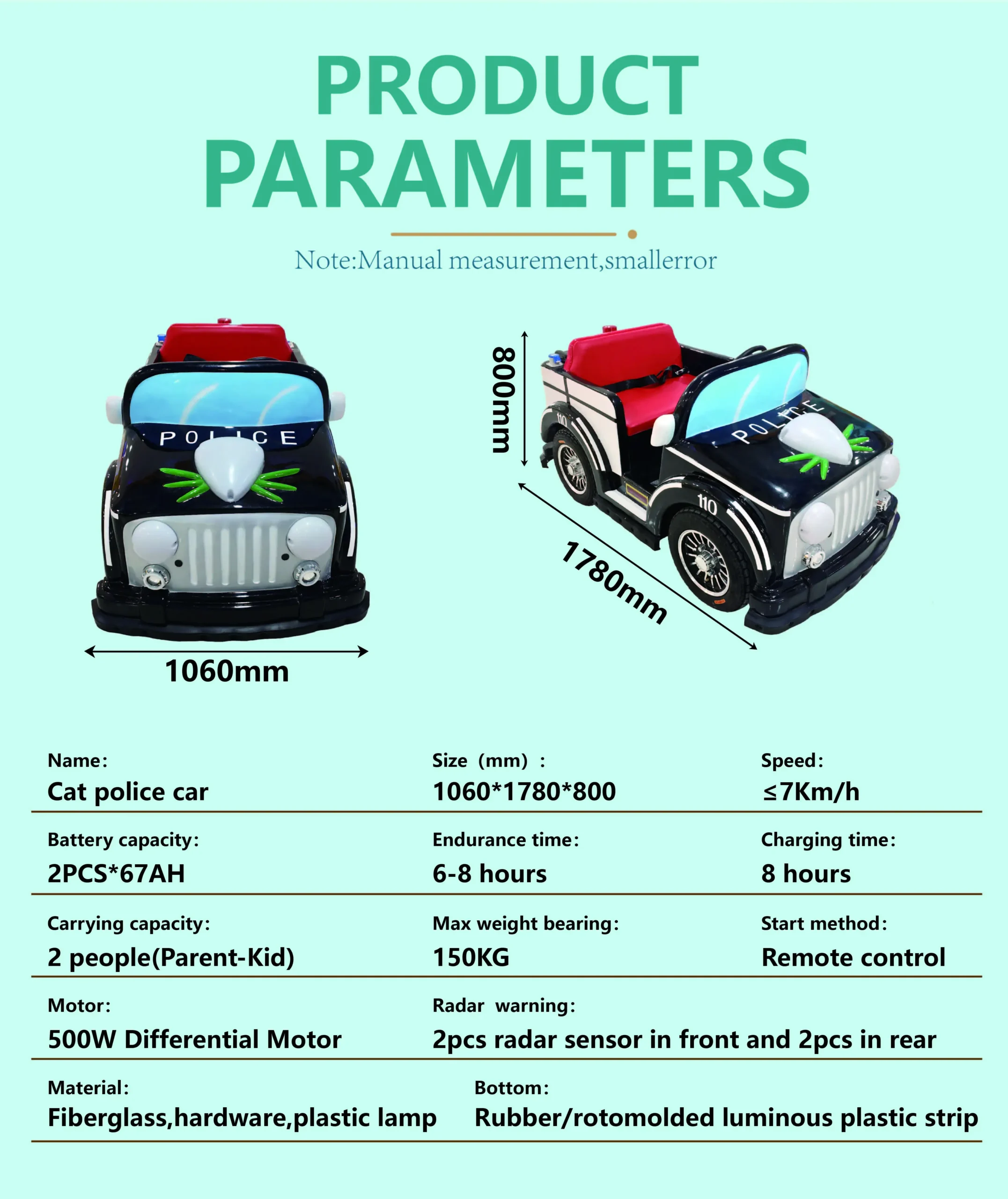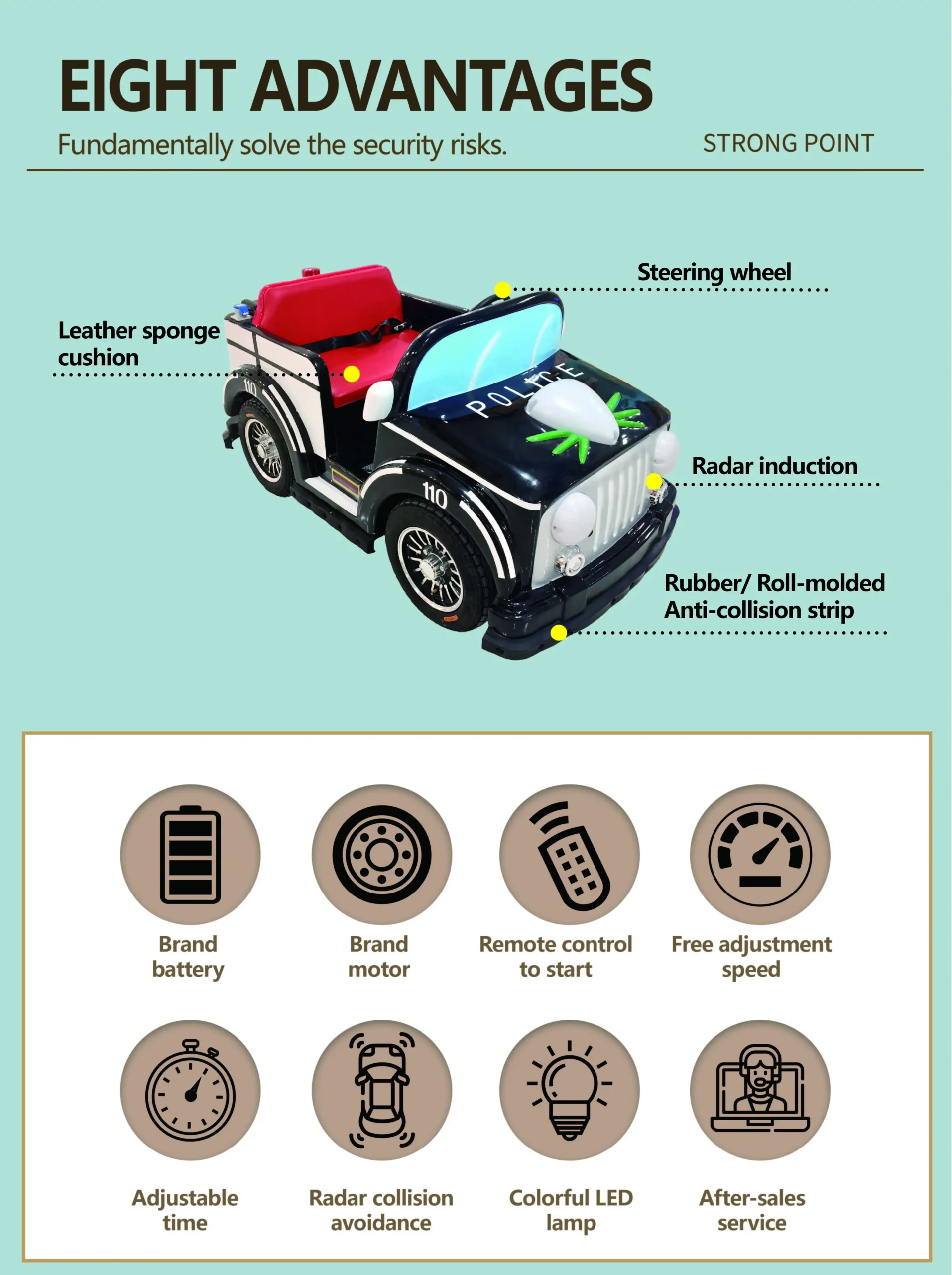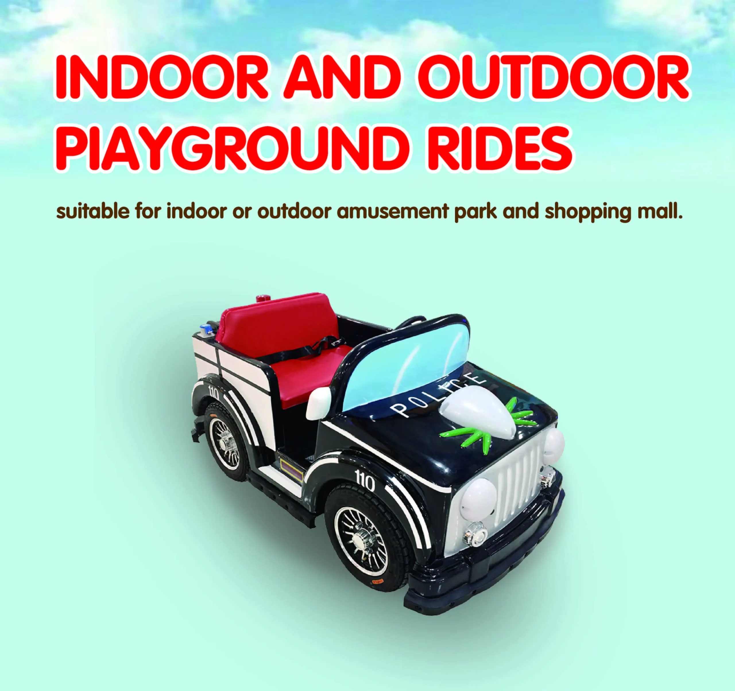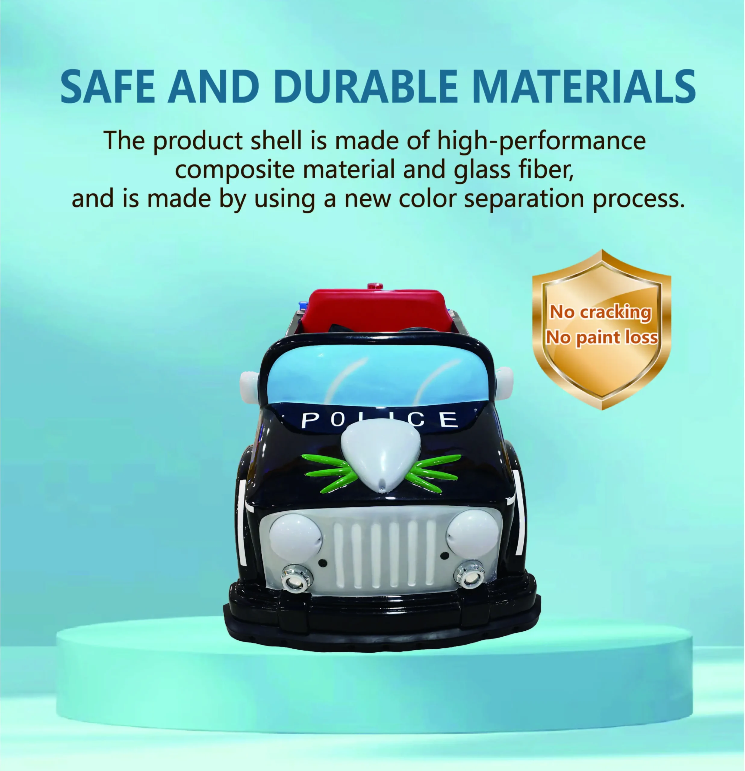 Our fiberglass-made Cartoon Police Plaza Car is ideal for shopping malls, plazas, amusement parks, and school play zones. Designed with safety-first technology, it includes LED lighting, interactive sensors, anti-fall protection, and waterproof durability. The eco-friendly battery ensures extended playtime. As an OEM supplier, we provide full customization services from logo branding to product design adjustments, giving operators a tailored solution for their target audience.