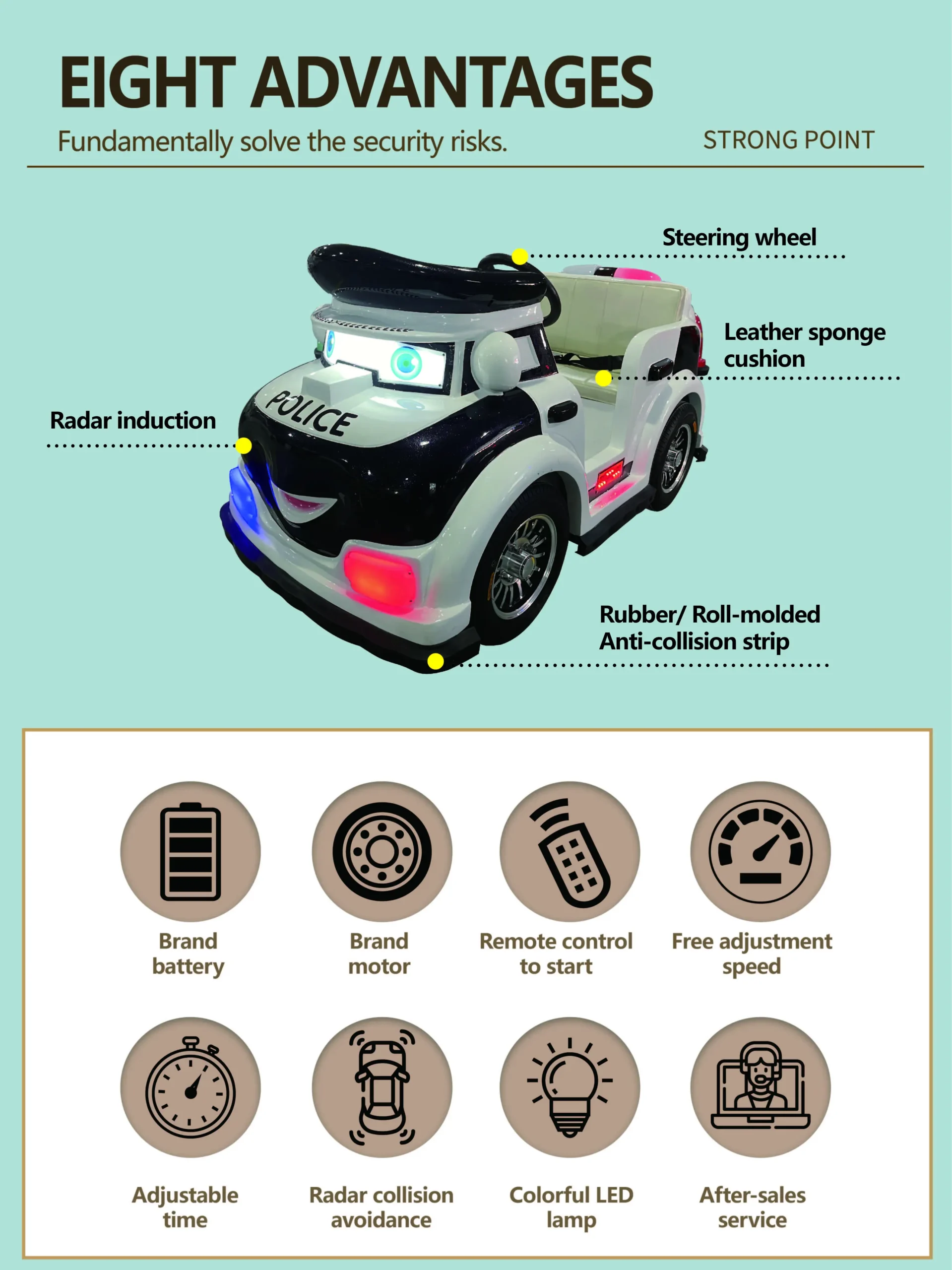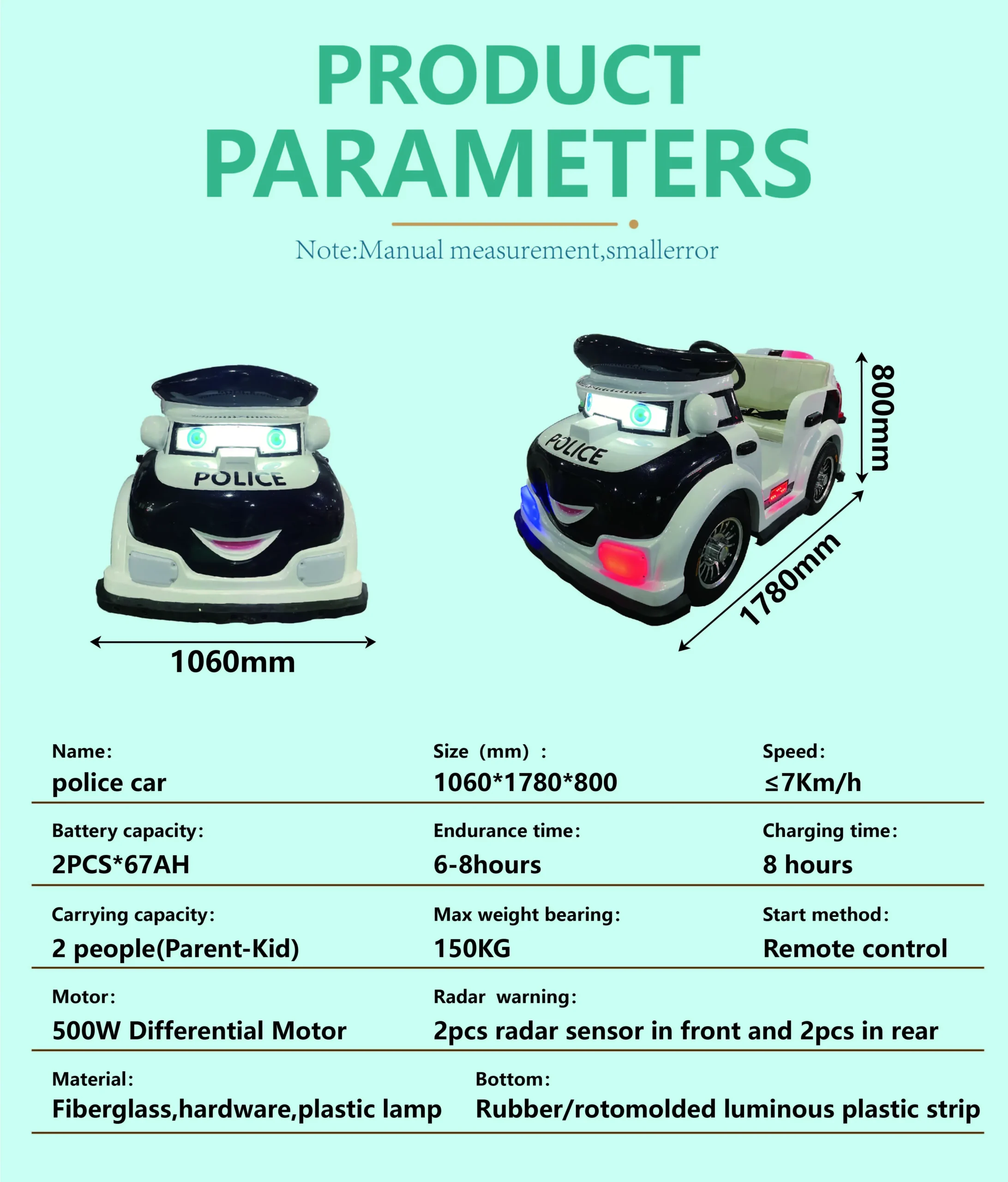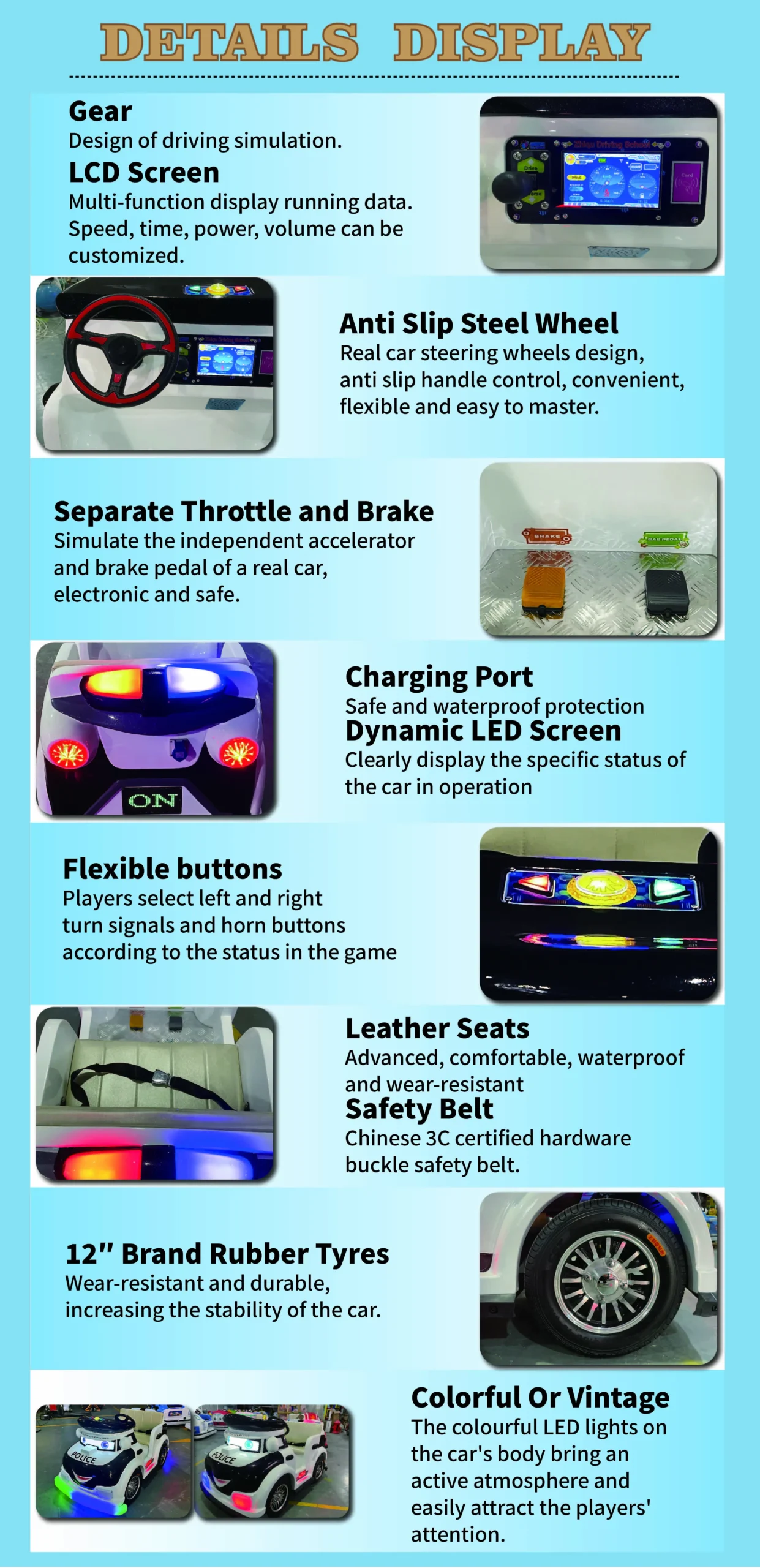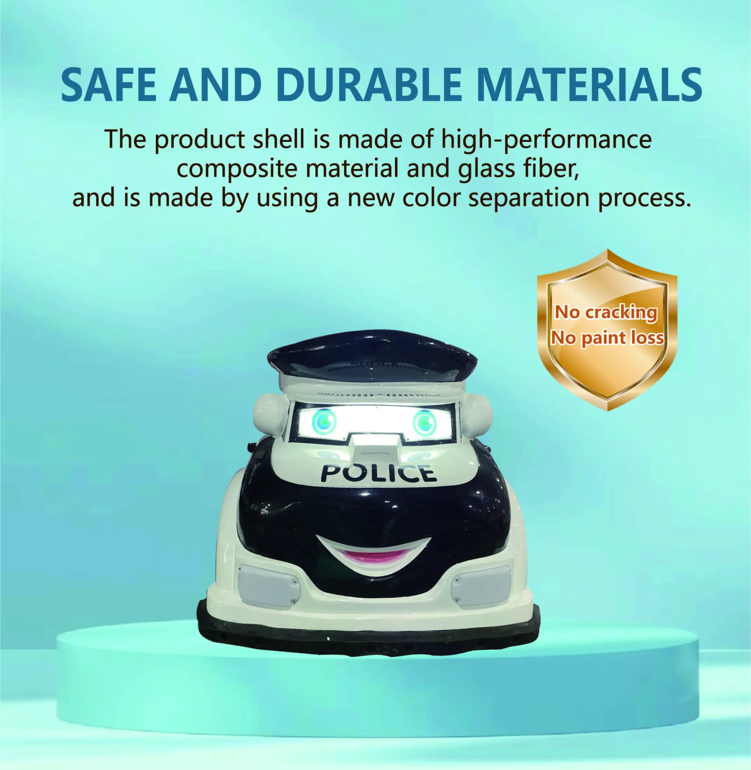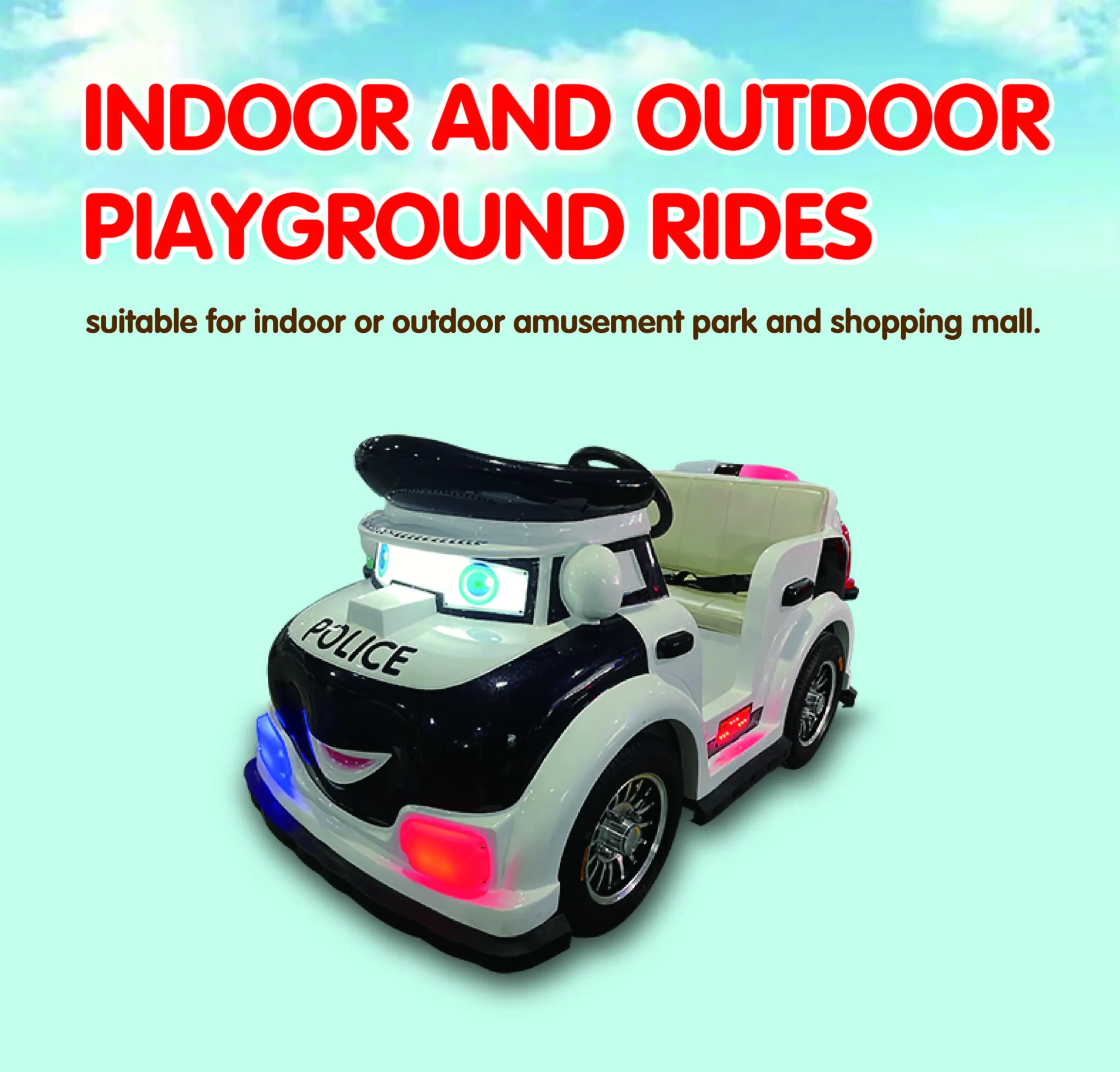 Our battery-powered cartoon police plaza car is an excellent attraction for family entertainment centers, outdoor plazas, kindergartens, resorts, shopping malls, and rental events. Built with eco-friendly fiberglass, this kiddie ride combines interactive sensors, LED light effects, and strong safety protection. Its long battery endurance, waterproof and sun-resistant design make it suitable for both indoor and outdoor venues. OEM customization allows you to add logos, themes, and color schemes, making it a versatile solution for global amusement operators.