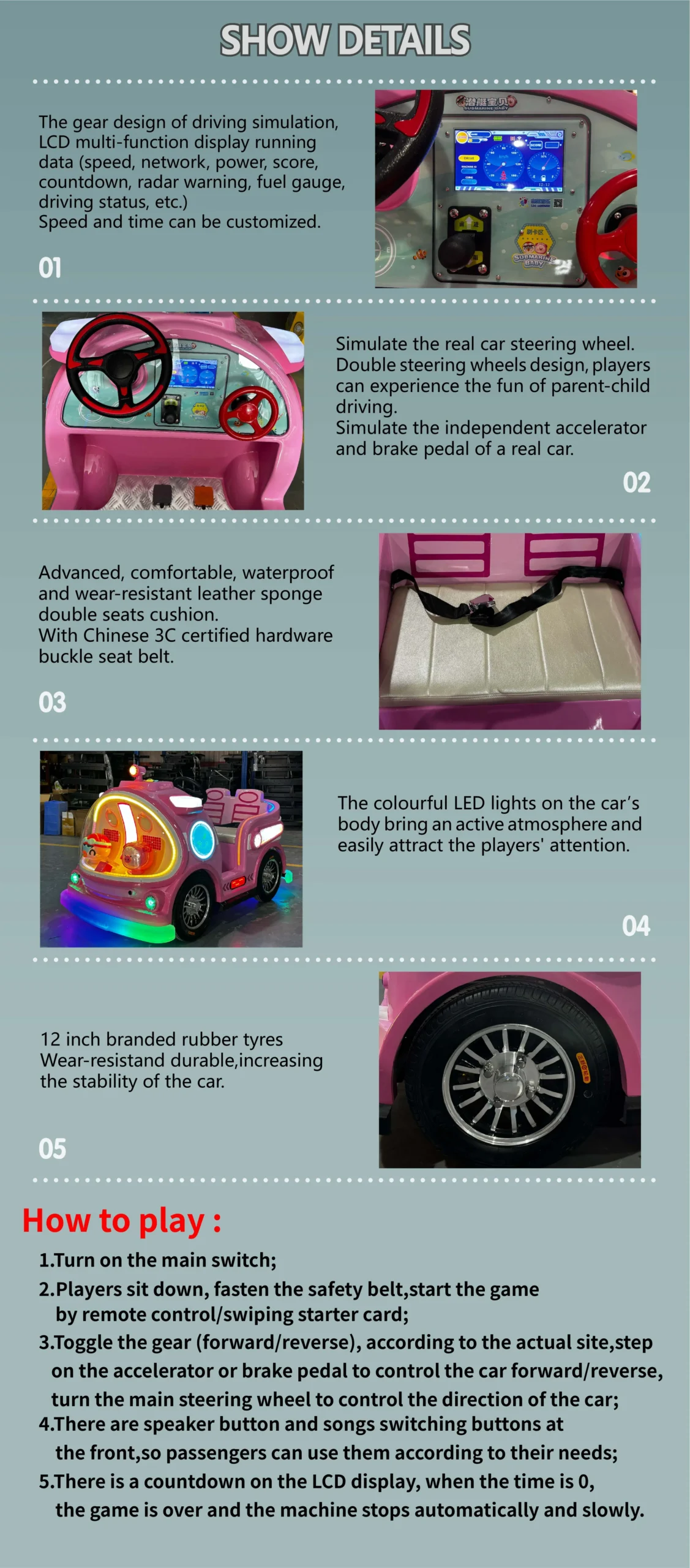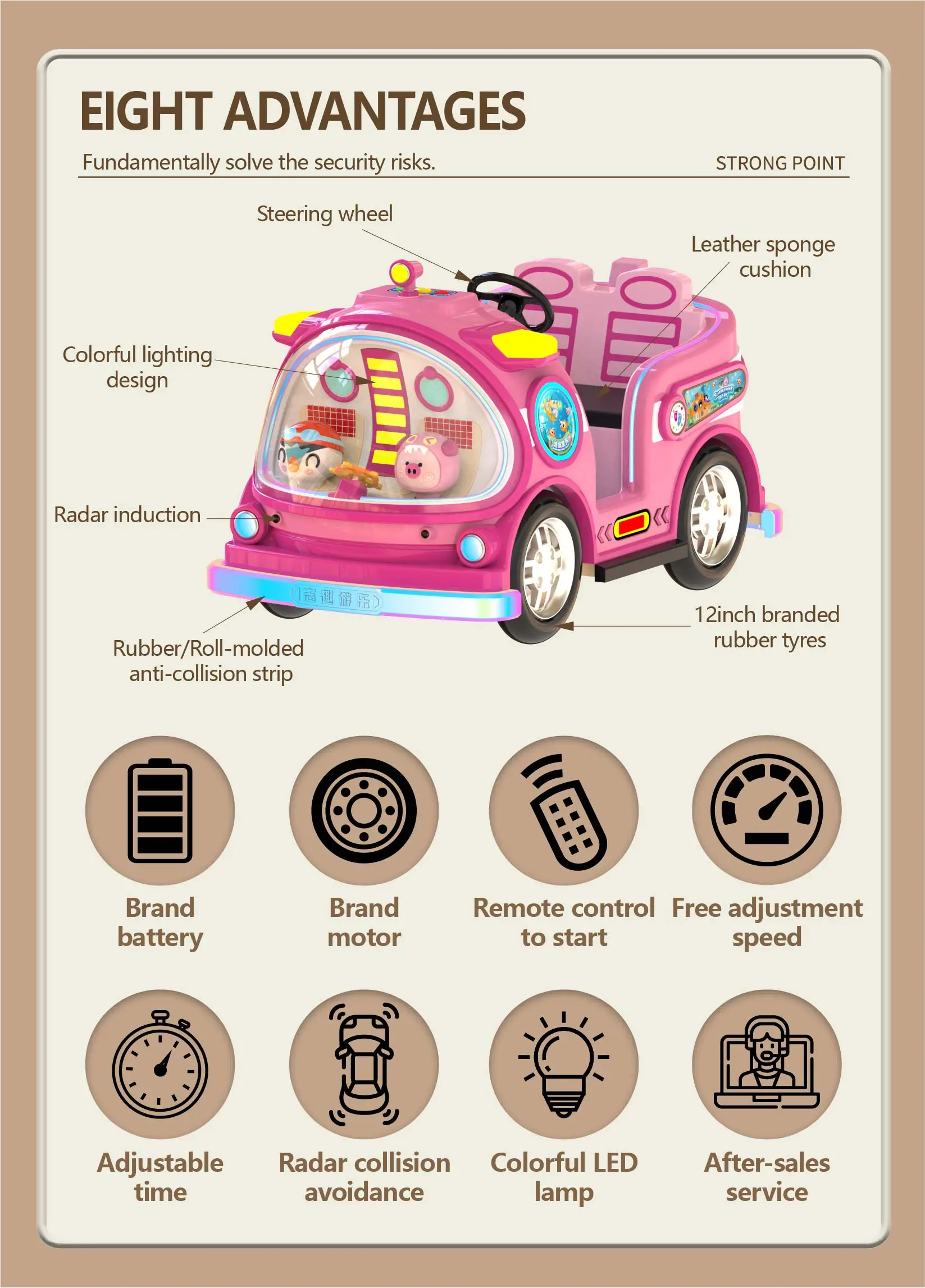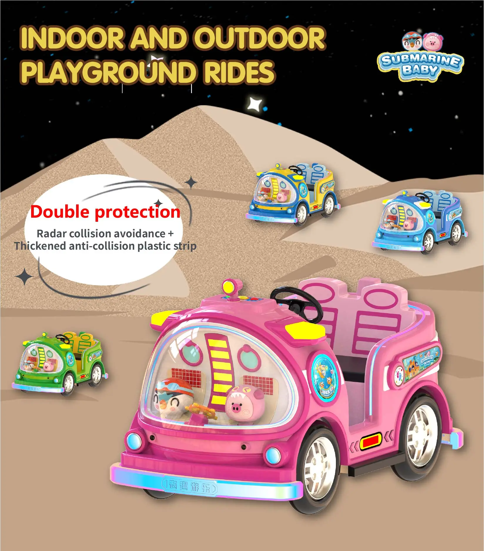 This battery-powered submarine plaza car is the perfect attraction for outdoor amusement zones, shopping malls, and family entertainment centers. Built with high-strength fiberglass, it ensures safety and endurance, while LED lights and big wheels enhance visual appeal. Its waterproof and UV-protected design ensures long-lasting use outdoors. With interactive sensing features, children enjoy immersive play. Available for wholesale and OEM customization, this ride is ideal for amusement suppliers and operators.