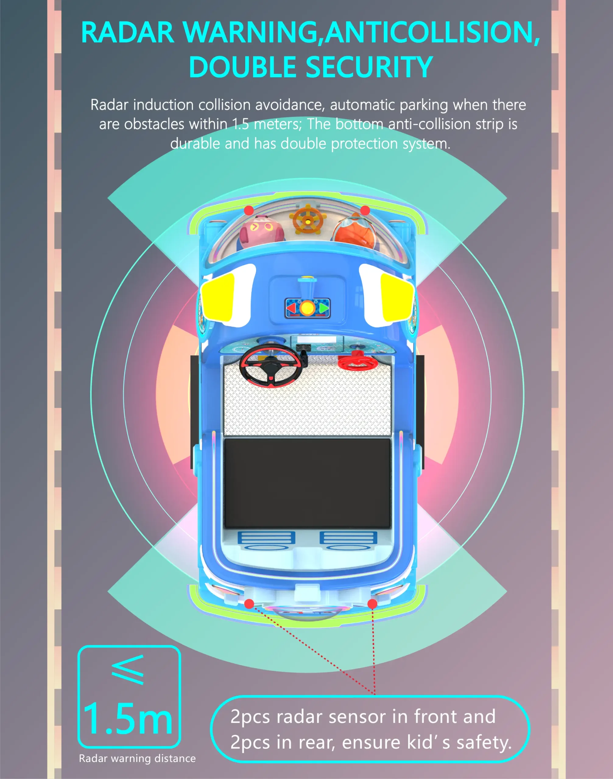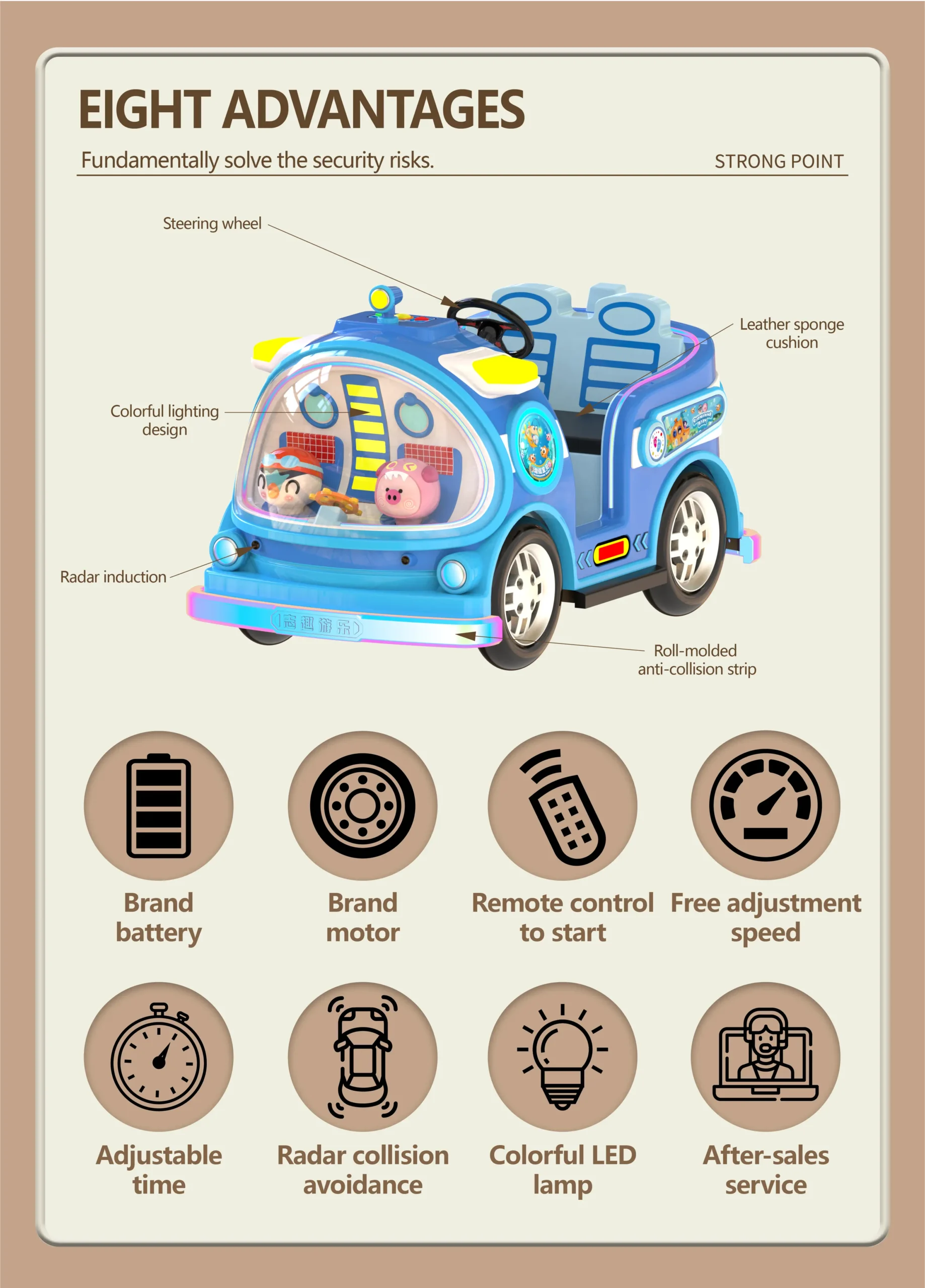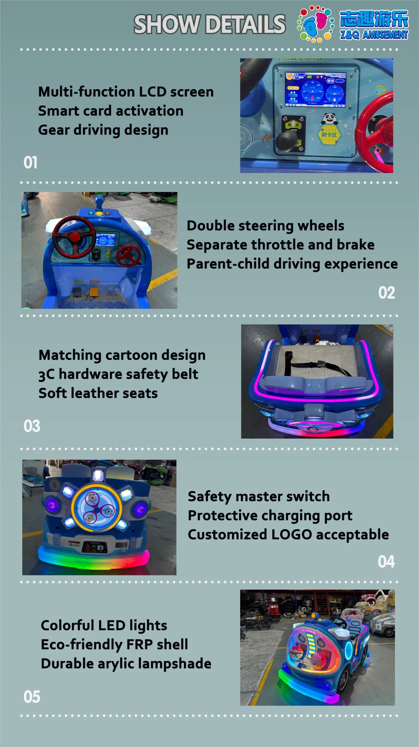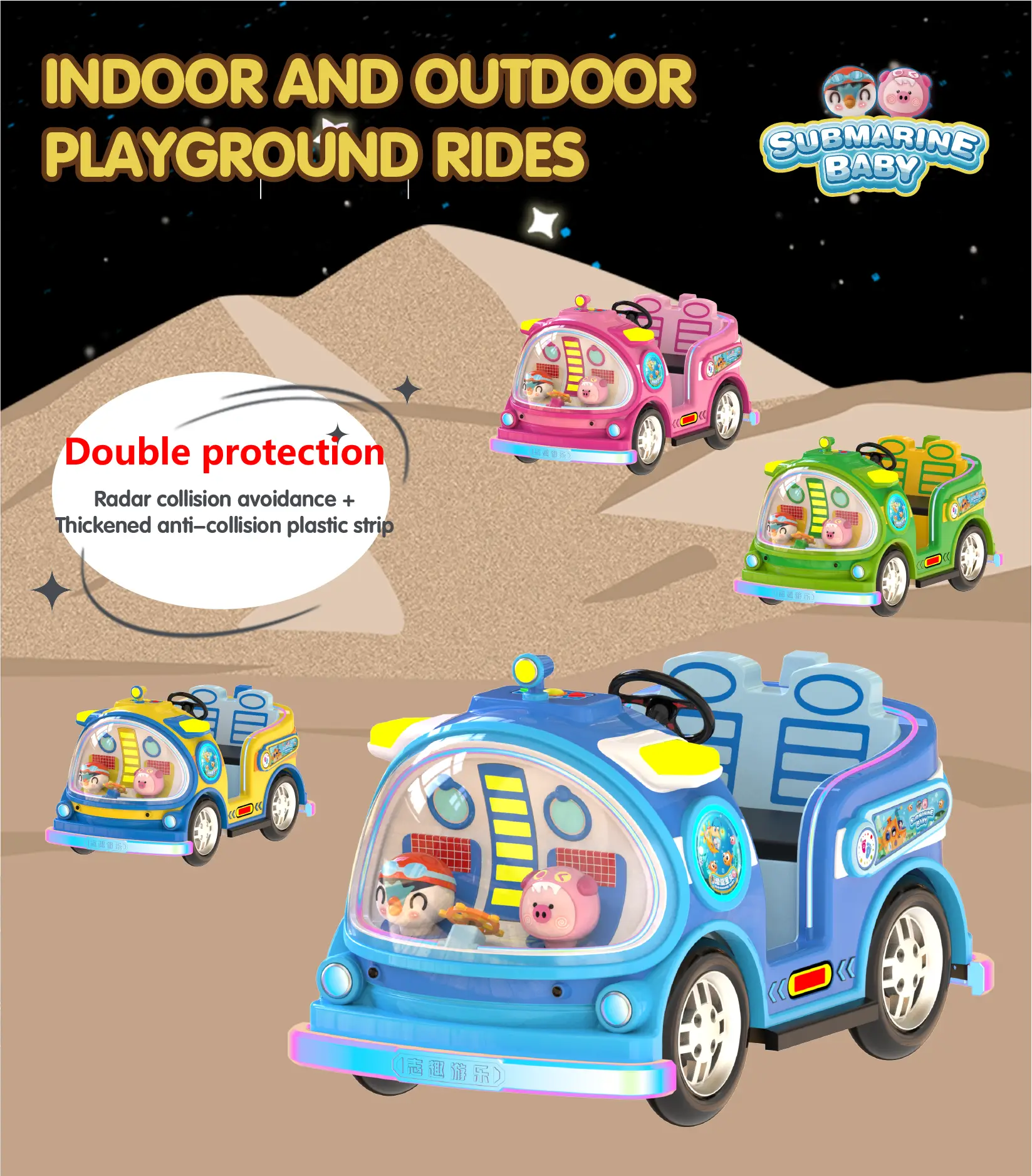 This submarine kiddie ride is engineered for professional amusement operators. With its fiberglass body and LED accents, it guarantees durability and appeal. The ride includes big tires for stability, smart sensing features for interactivity, and multi-level safety including waterproof, anti-collision, and anti-sun damage. Ideal for plazas, FECs, rental businesses, and resorts, it offers flexible OEM design for international buyers who want to stand out with custom branding and features.