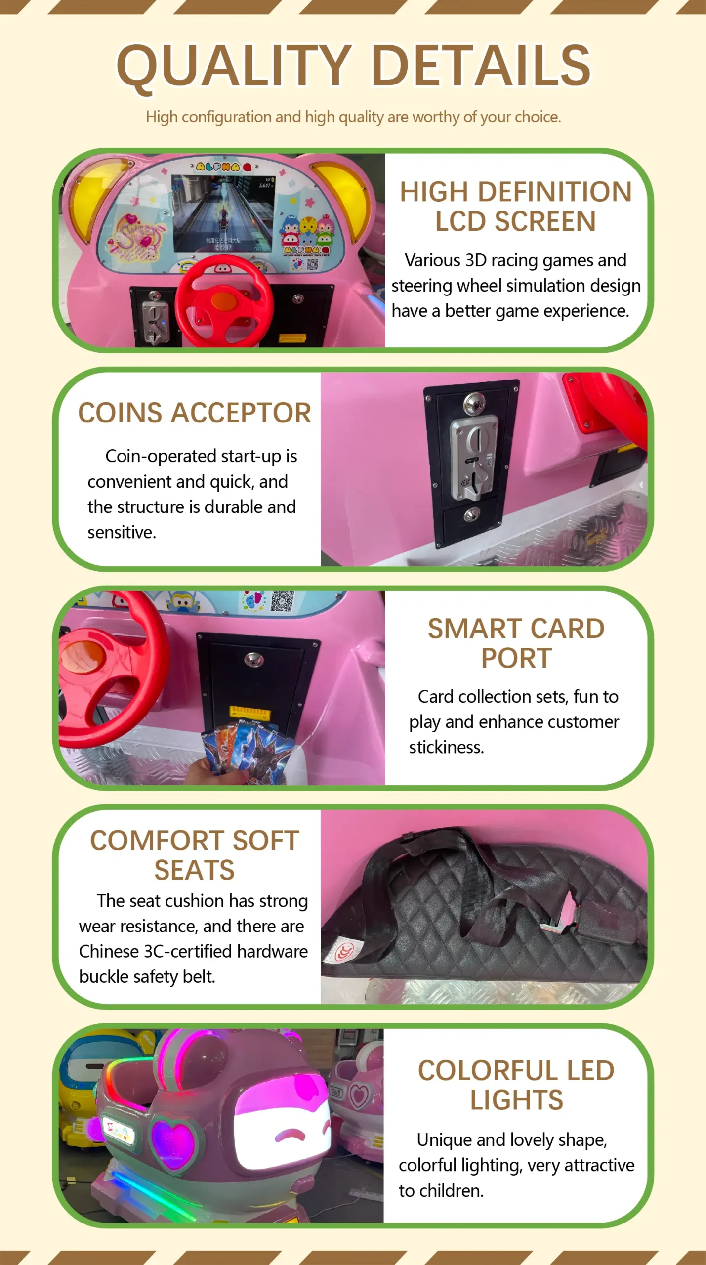 Our pink cartoon ride-on kiddie cars are designed with fiberglass structure, ensuring durability, safety, and eco-friendliness for long-term use. With built-in anti-fall, anti-collision, waterproof, and sunproof features, these rides are perfect for both indoor and outdoor amusement parks, shopping malls, kindergartens, family entertainment centers (FECs), and community playgrounds. The advanced interactive sensing system engages children with fun responses, while multiple payment modes—coin, card, NFC, and QR code—make operation convenient for modern venues. Supporting OEM/ODM customization, we help B2B clients create tailored solutions for themed parks and brand-specific attractions.