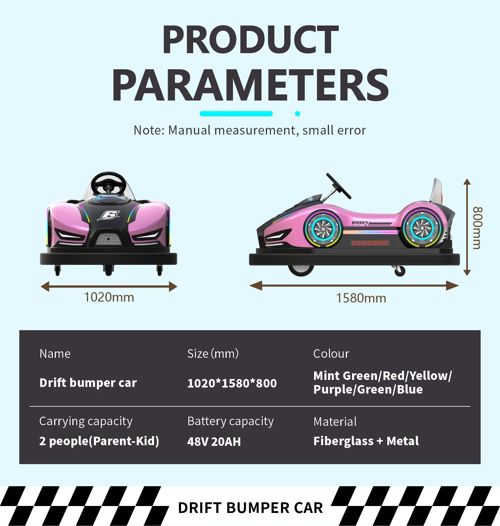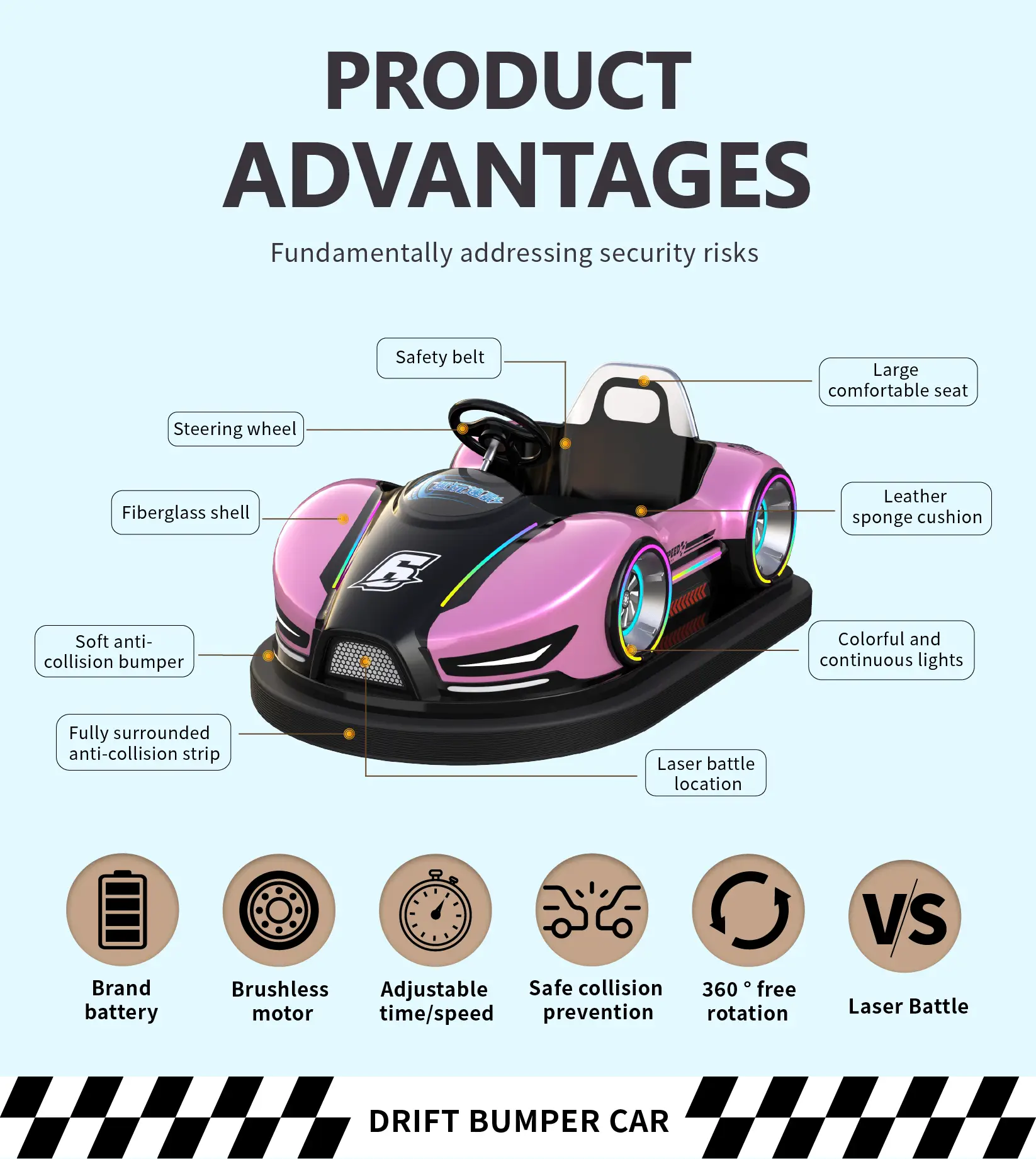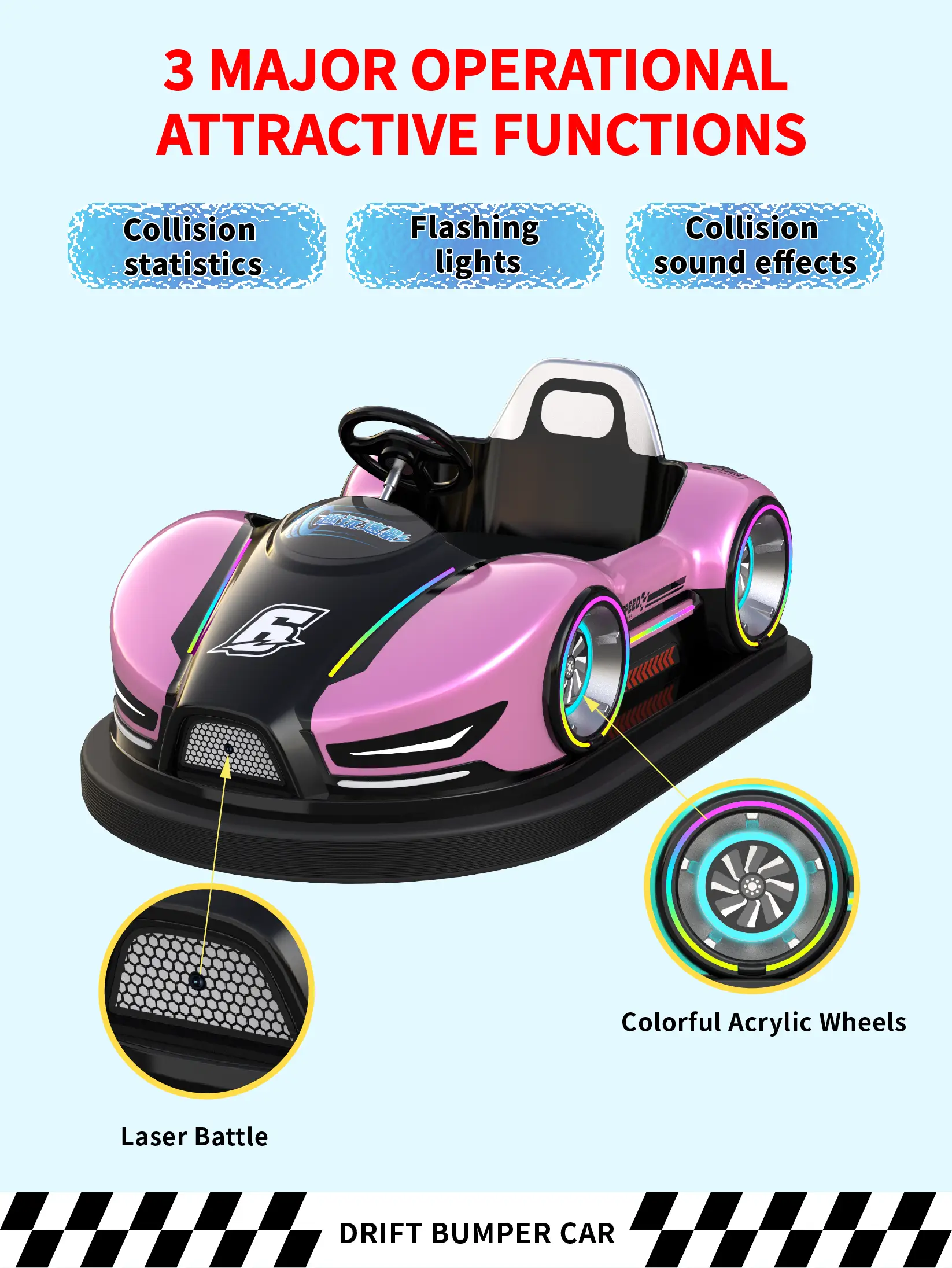 Our pink electric kiddie bumper cars are designed for both indoor and outdoor amusement venues, offering anti-collision, anti-fall, waterproof, and sunproof protection to ensure maximum safety and durability. Built with fiberglass structure and equipped with interactive sensing technology, these rides provide a fun and engaging experience for children while minimizing maintenance needs. With long battery life and eco-friendly materials, they are ideal for theme parks, FECs, shopping malls, rental businesses, and playground operators. We offer full OEM/ODM customization, including colors, logos, and control systems, making them the perfect solution for B2B buyers looking for reliable wholesale amusement equipment.