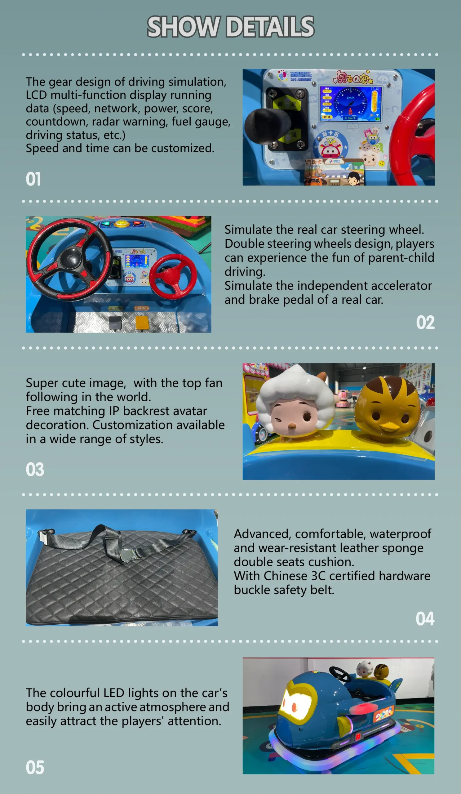 Plaza ride-on cars are designed for high-traffic commercial areas such as malls, outdoor squares, and family amusement parks. Built with fiberglass bodies, LED lighting, and full weather resistance, they provide durable and customizable fun. OEM service supports bulk orders and personalized design.