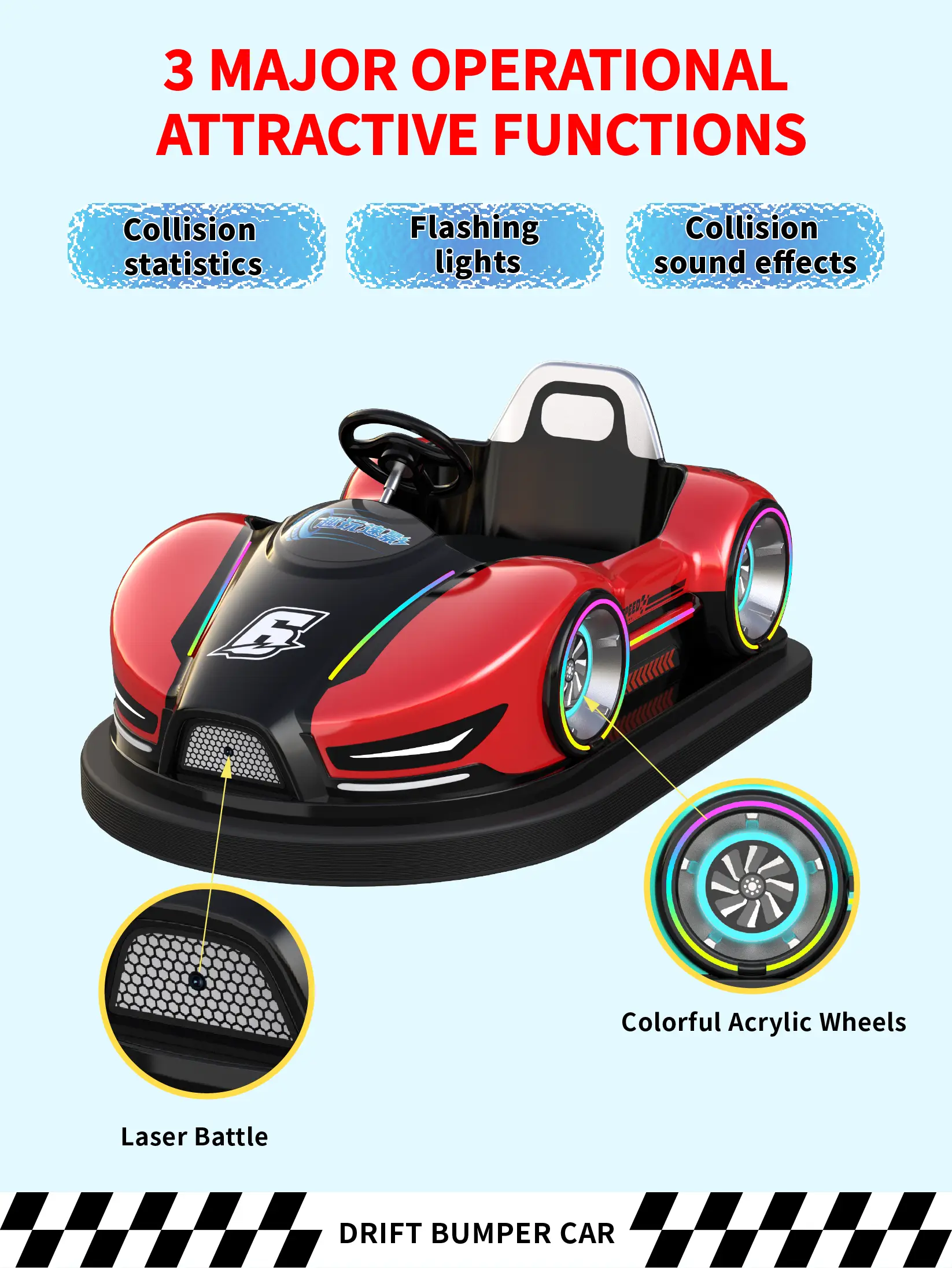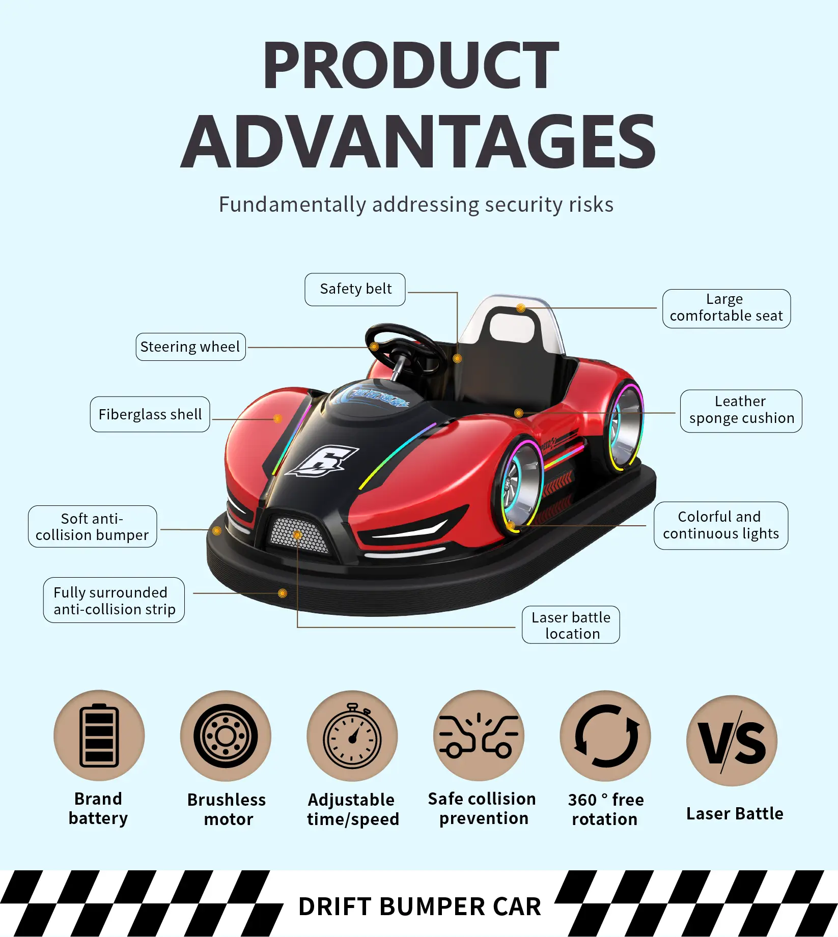 Our red electric kiddie bumper cars are designed for indoor & outdoor amusement parks, FECs, shopping malls, plazas, kindergartens, family entertainment arenas, and rental businesses. With their durable fiberglass body and interactive sensor technology, they ensure safety, fun, and long-lasting performance.