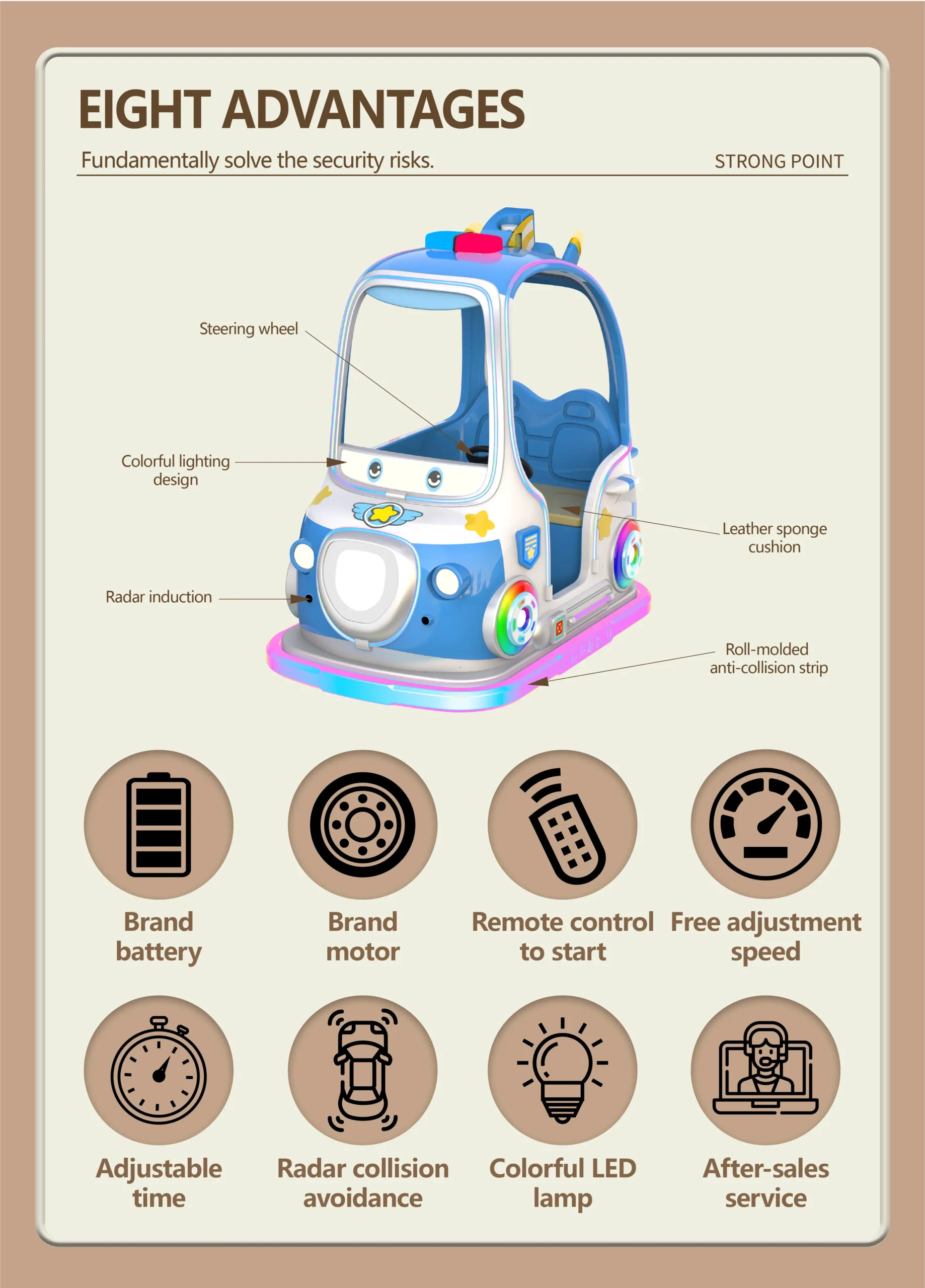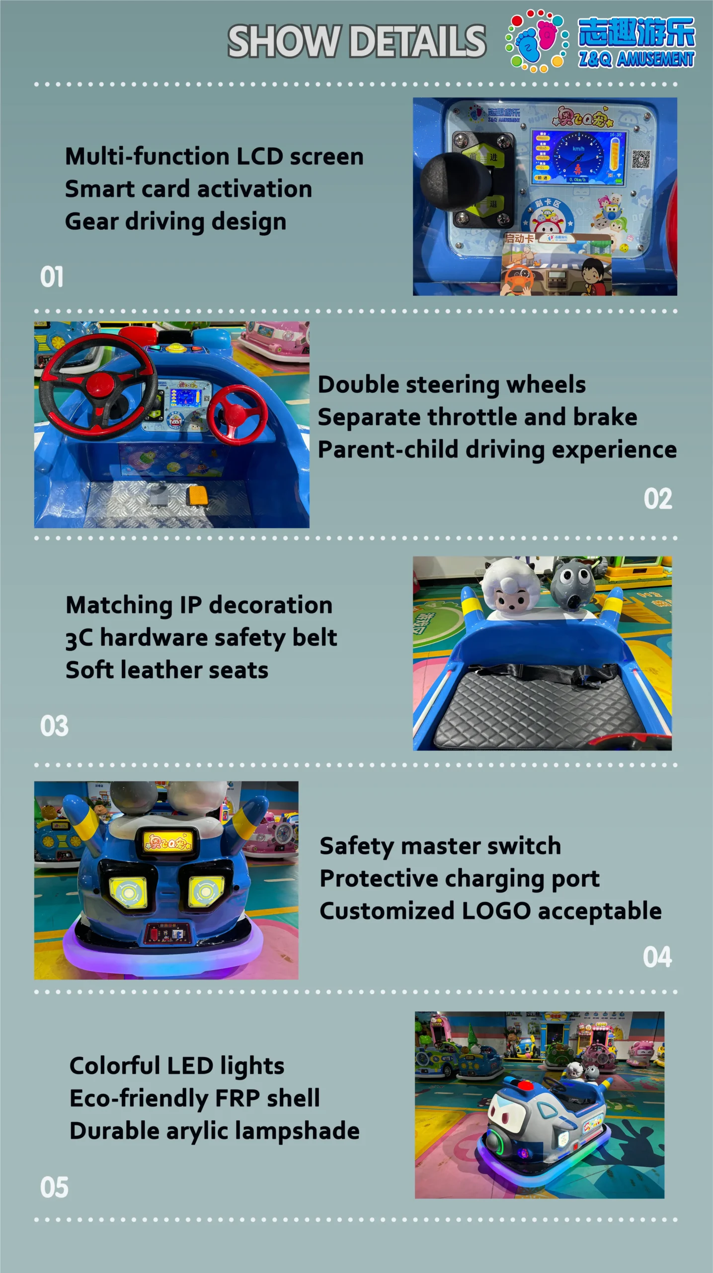 Our plaza cars are designed for outdoor use, perfect for amusement parks, plazas, malls, kindergartens, and community play areas. With fiberglass structure and safety features such as anti-crash, anti-fall, waterproof, and sun-resistant design, these cars are built for long-lasting operation. The LED lights and interactive sensors attract children and enhance engagement. Ideal for B2B buyers, OEM customization allows you to add branding, colors, and unique designs for bulk orders.
