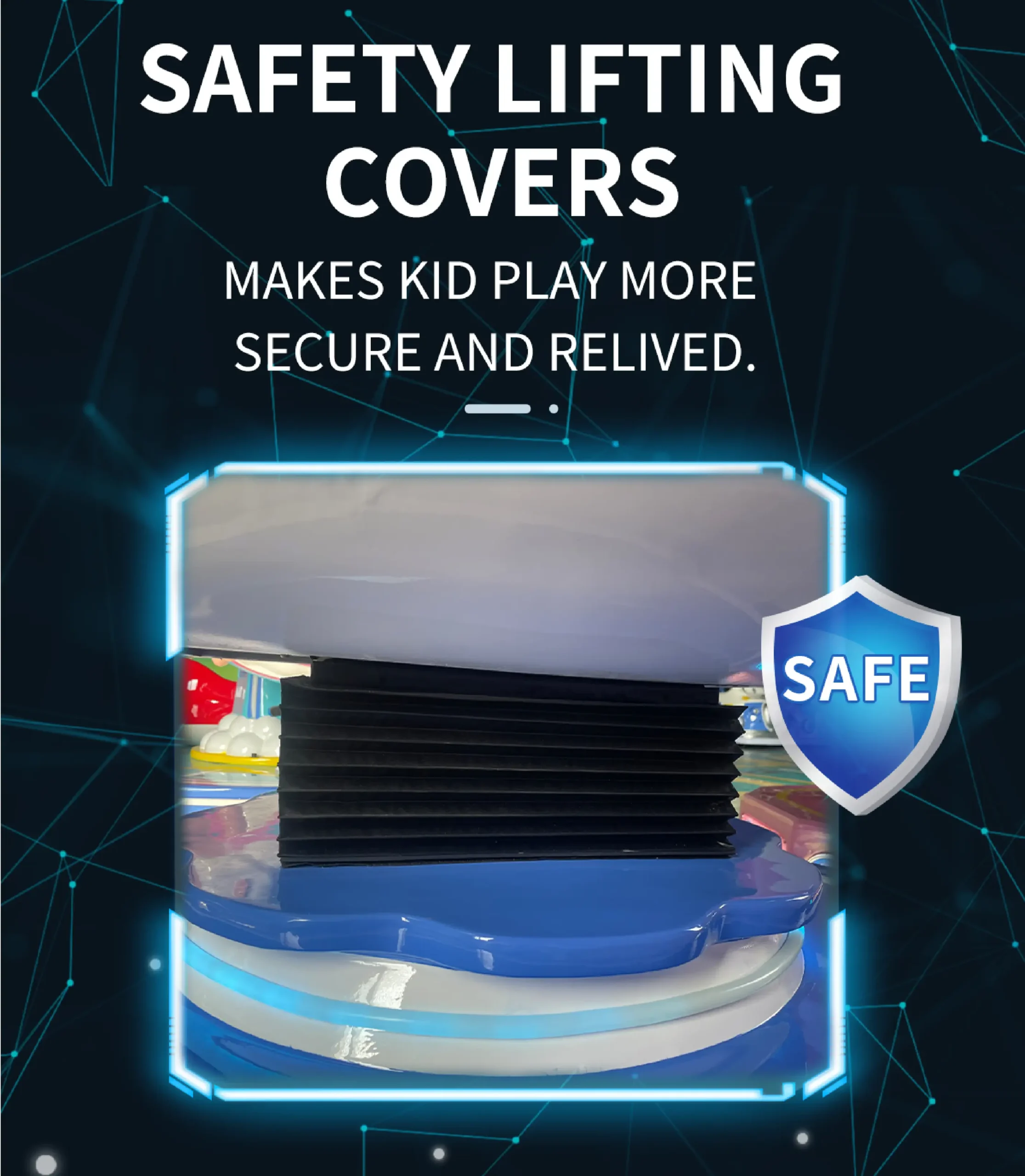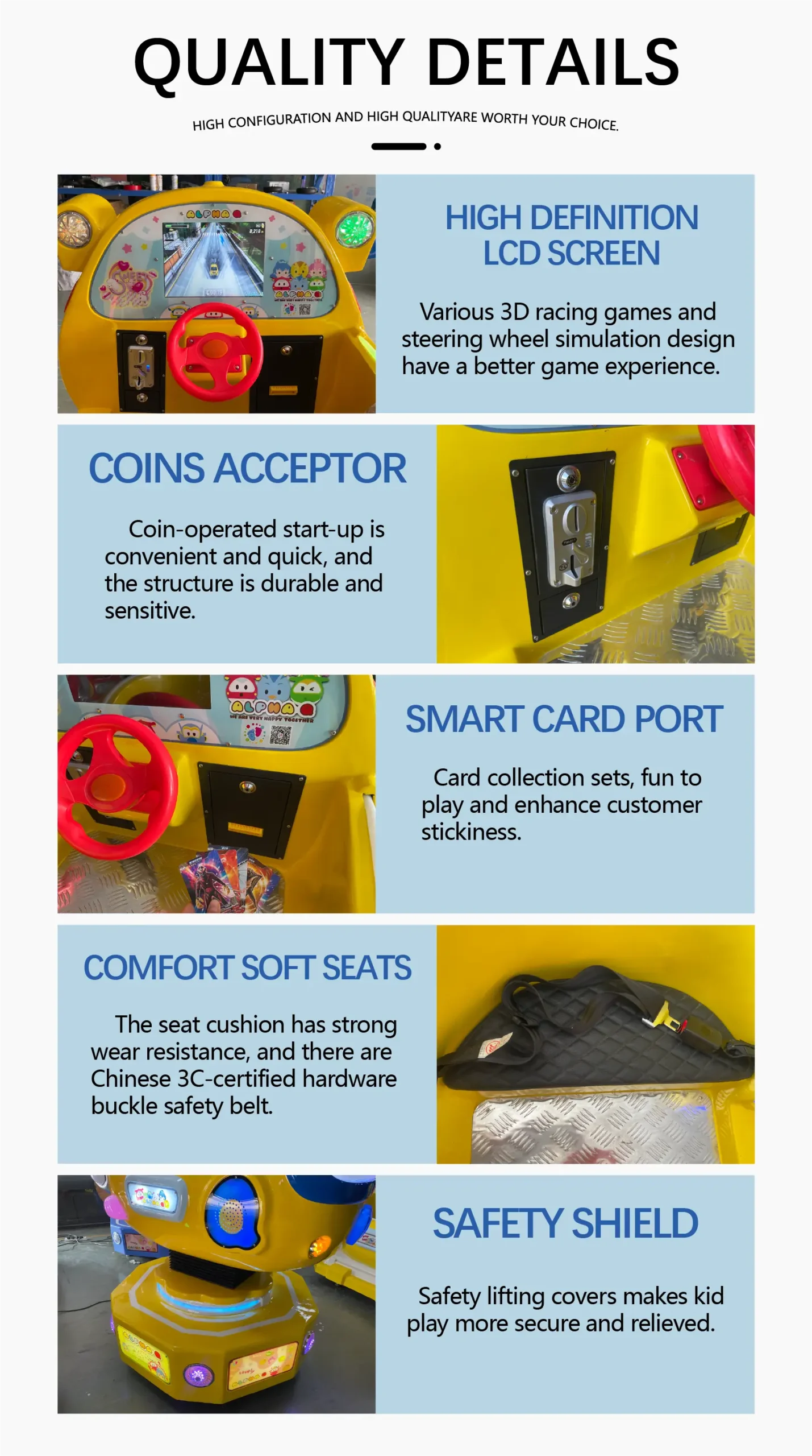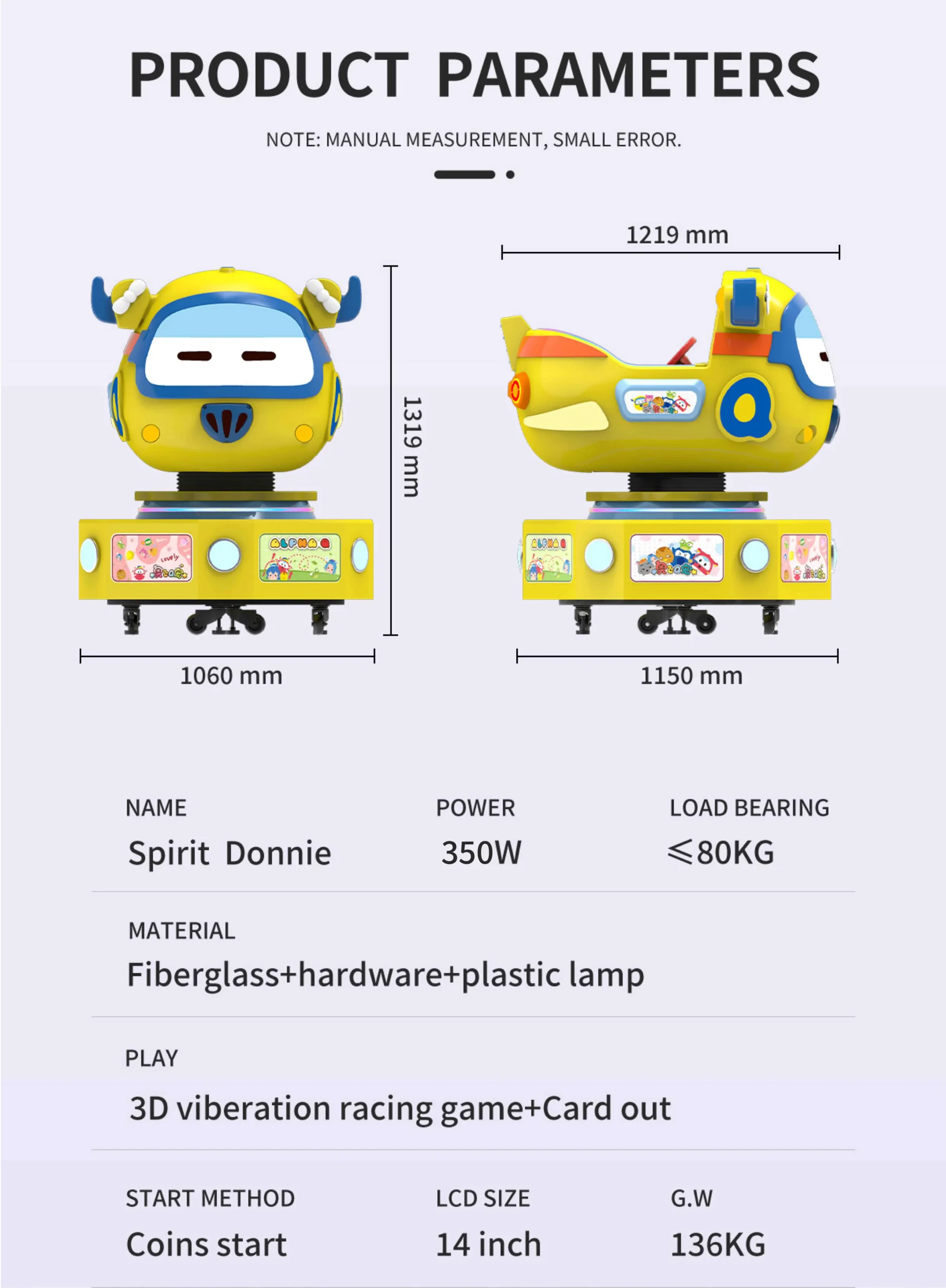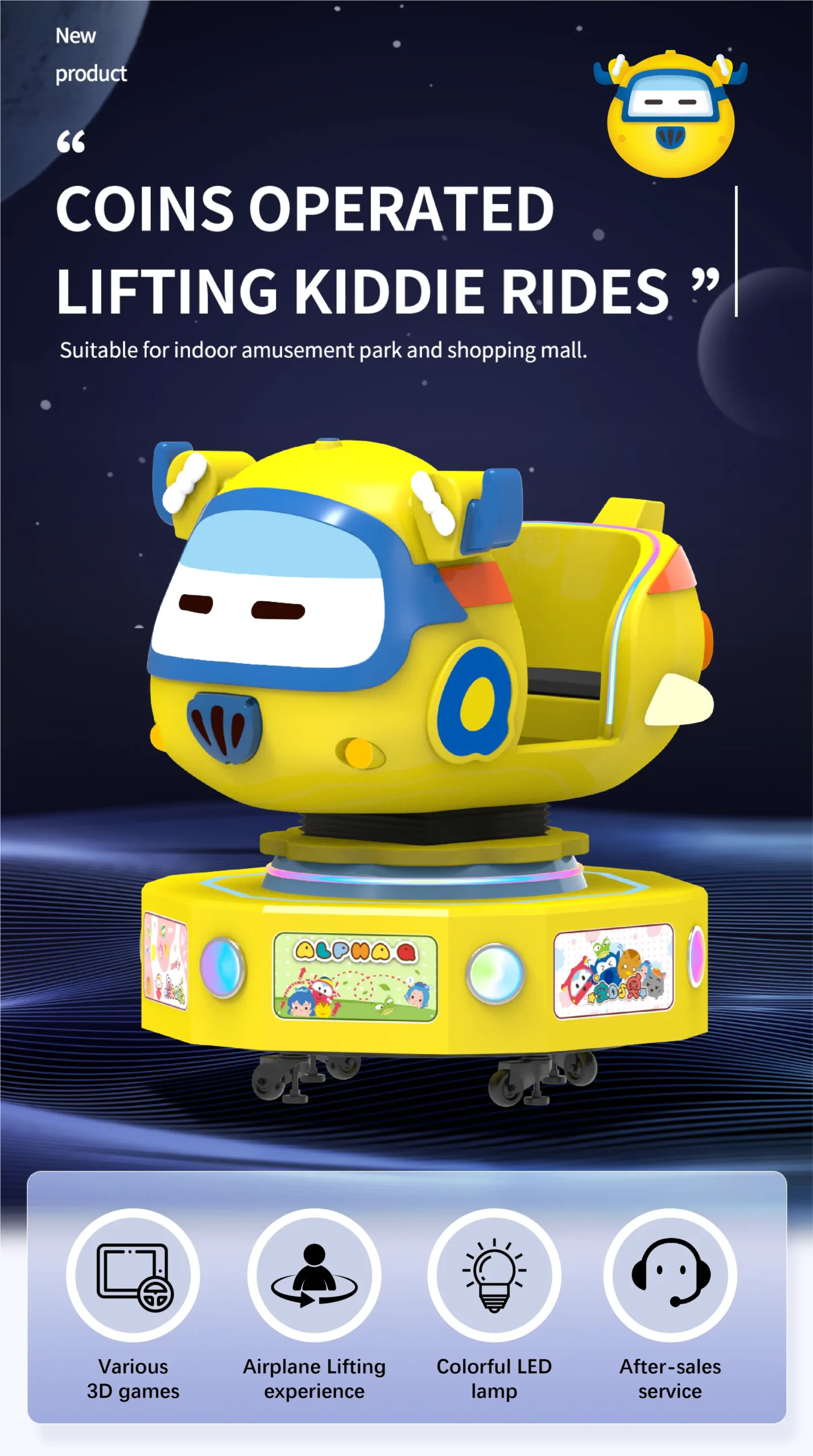 Our yellow cartoon ride-on kiddie car is designed for commercial amusement businesses, malls, kindergartens, and outdoor entertainment parks. Built with a durable fiberglass body, it offers anti-collision, waterproof, anti-UV, and long-lasting performance, making it ideal for both indoor and outdoor use. The built-in interactive sensor system enhances children’s engagement, while the eco-friendly structure ensures sustainability. As a factory OEM/ODM supplier, we provide flexible customization in design, payment modes (coin, card, NFC, QR code), and branding, helping B2B clients create unique attractions and profitable entertainment solutions.